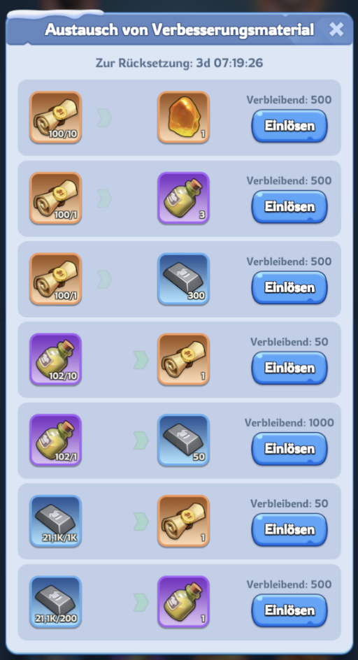 Sobald du ein Ausrüstungsteil auf Mythisch T2 mit 3 Sternen aufgewertet hast, wird der Verstärkungsmaterial-Tausch freigeschaltet.