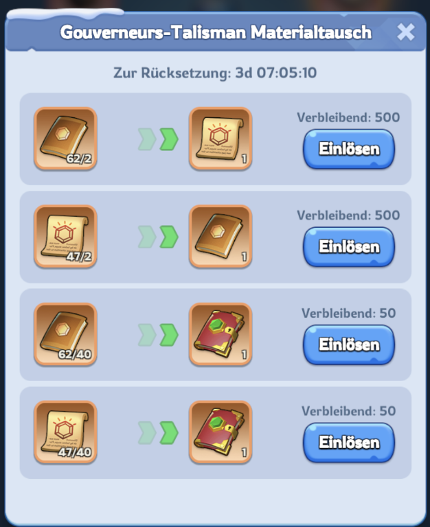 Sobald dein Staat die Generation 7 der Helden erreicht hat, schaltet man automatisch Talisman bis Stufe 16 frei. Wenn du mindestens ein Talisman auf Stufe 11 hast, dann schaltet man auch den Talisman-Materialtausch frei: