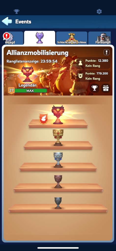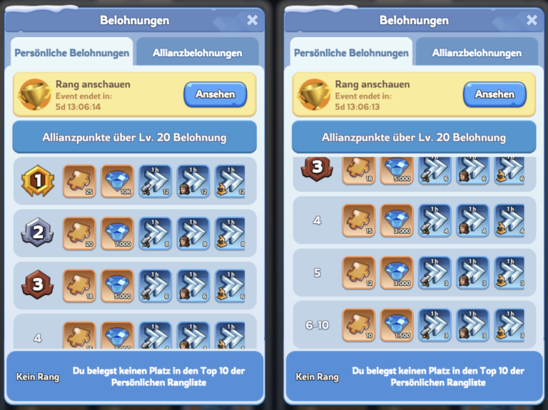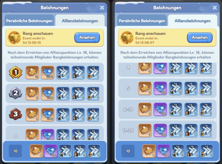 Wenn deine Allianz die höchste Stufe, also „Legendär“ erreicht, bleibt diese dort. Wenn deine Allianz jedoch unter den letzten drei Rängen landet, wird sie herabgestuft. Dauerhaft niedrige Ränge halten deine Allianz in einer niedrigeren Stufe. Jede Stufe bietet einzigartige Belohnungen für das persönliche Ranking, das Allianz Ranking und das Allianz-Denkmal.