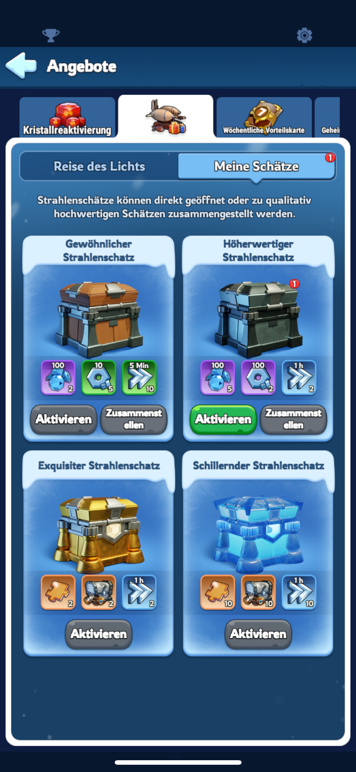 - 3 gewöhnliche Strahlenschätze ergeben 1 Premium-Truhe.
