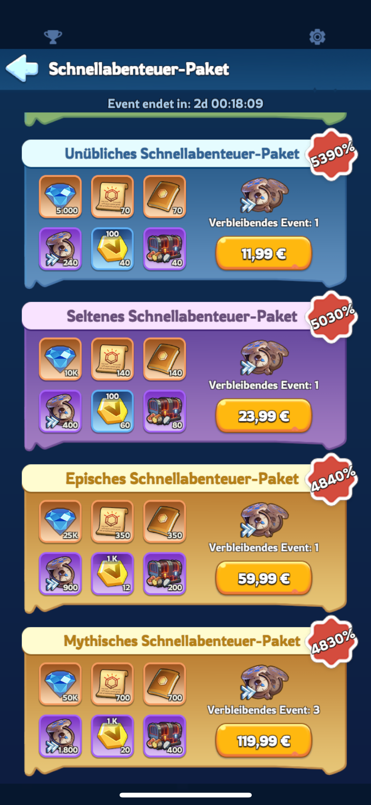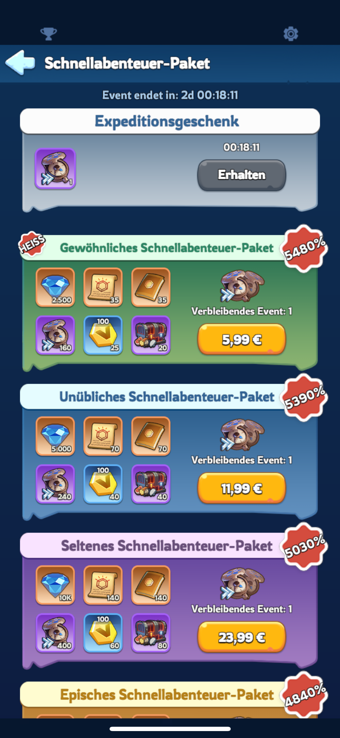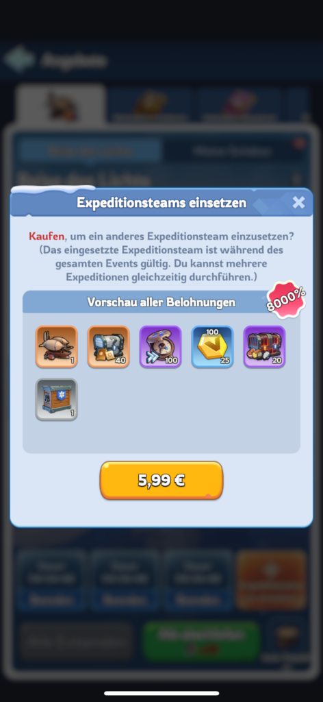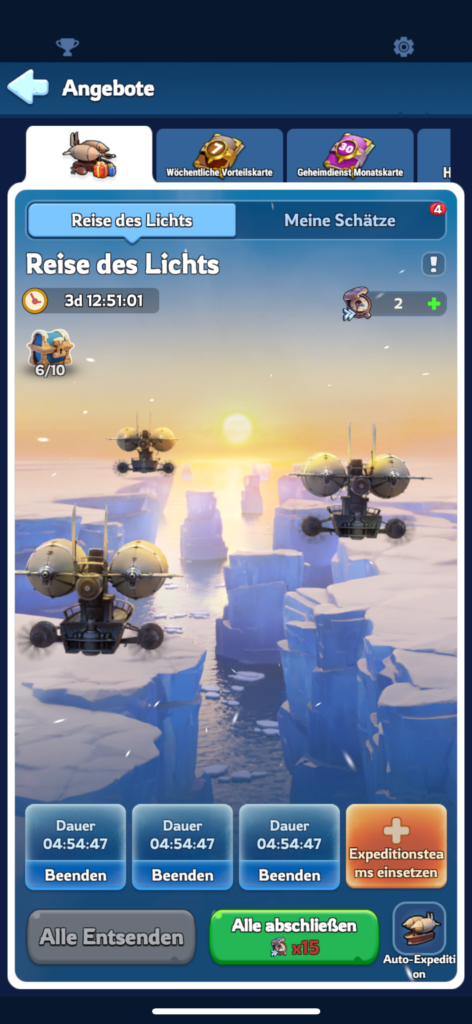 - Hinweis: Es können F2P 39 Truhen erhalten werden. Dafür müssen alle 8 Stunden erneut Expeditionen gestartet werden, sowie drei Expeditionsteams freigeschaltet worden sein. Kurz bevor das Event endet schickst du noch einmal Expeditionen los. Diese können noch nach Ende des Events eingesammelt werden.