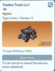 -The Primary Rewards for Alliance showdown is 2 Unique Mythic Decorations for your Daybreak Island. The Giant Horn (Troop attack 1%) and Tundra Truck (Troop defence 1%). These rewards can not be purchased in the normal shop and can only be won in this event or merged using general shards. The Winning alliance will have more resource