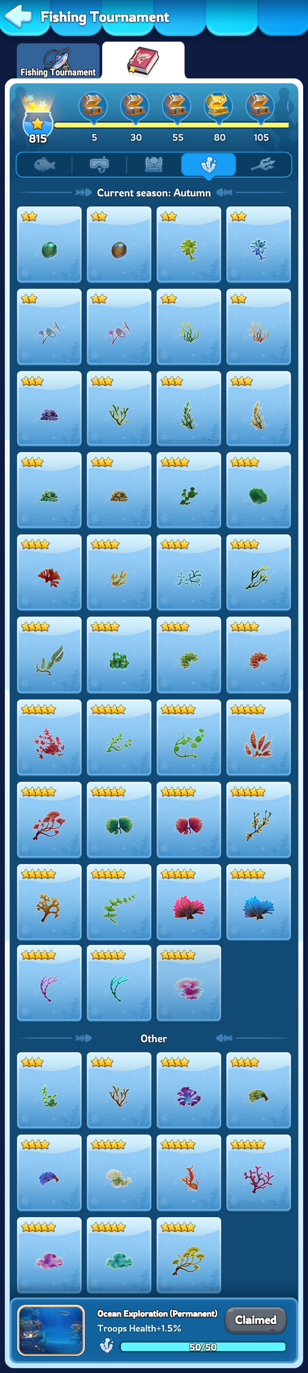 – Fish Guide (150) -> Treasure Stronghold (Permanent), Furnace Skin, Effect: Troops Attack +2.0%