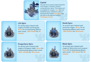 – The Capital is buttressed by four mighty Spires that may also be occupied in alternate 30-minute intervals (30 minutes of battle time followed by 30 minutes in protected mode).