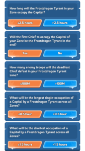 Chiefs enlisted by their alliances can fight for control of the Capital on the Frostdragon Battlefield. The event lasts for 6 hours, during which alliances compete to dominate the Capital. Only the rally captain’s occupation time counts toward claiming the title of Frostdragon Tyrant. The Chief who controls the Capital the longest after the event will be crowned the Frostdragon Tyrant for their Zone.