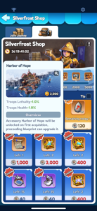 • Old event city, march and teleport skins can be purchased with 3,000-5,000 silver shells, amount will vary per silver shell event and based on state age. These skins are in the form of custom “choose your own skin” style items that allow players to pick a previous event skin of their own choosing. If they have all the skin options and still buy the item, they can get either 100 (city skin chest) or 20 (march and teleport skin chest) mythic general hero shards.