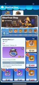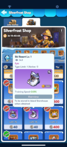 • Island buildings available are the Harbour of Hope which grants 1% lethality and health per level (up to 10% each when maxed), the Skating Rink which grants 2% research speed per level (up to 10% when maxed), and the Ski Resort which grants 3% training speed per level (up to 15% when maxed).