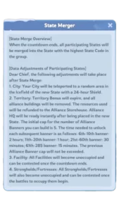 Alliance Tag: If there are duplicate alliance tags after State Merge, the tags of the alliances involved will be reset. R4/R5 alliance members can change the alliance tag once for free in Alliance Settings.