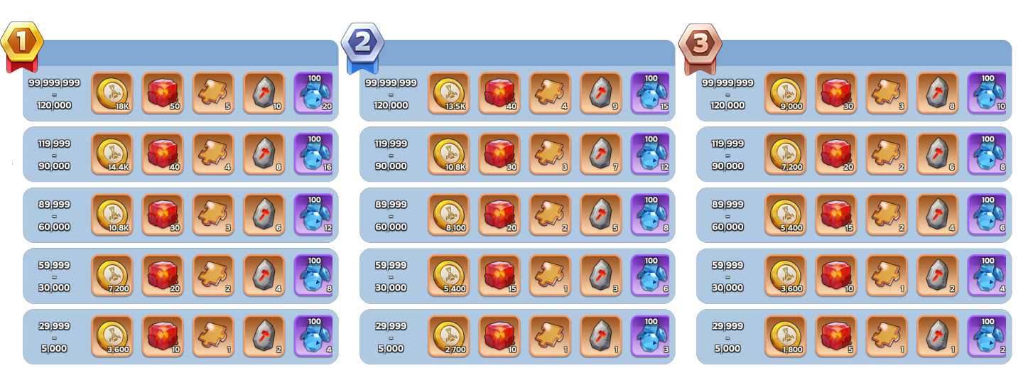 Les récompenses attribuées aux Légions 1 et 2 sont calculées et distribuées en fonction du classement individuel en points.