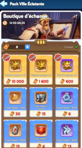 ● Achetez le Pack Ville Éclatante pour recevoir un Coffre à Tome Glorieux de Chance. Ouvrir ce coffre garantit une quantité aléatoire (5-100) de Tomes Glorieux. Utilisez ces tomes pour échanger des skins de ville, d’autres objets et des ressources dans la boutique d’échange à durée limitée.