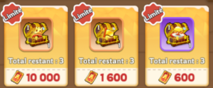 → Une fois le premier pack quotidien acheté, vous recevrez le nombre normal de Coffre à Tome Glorieux de Chance sans réduction. Après cet achat, chaque pack pourra être acheté jusqu’à 3 fois supplémentaires pour les deux premiers, et 5 fois pour le troisième.