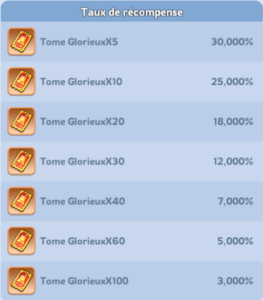 ● Le jeton d’événement Tome Glorieux est valable indéfiniment et ne sera pas supprimé à la fin de l’événement. Il peut être conservé pour le prochain événement. Voici les chances d’obtenir des tomes glorieux dans le coffre:
