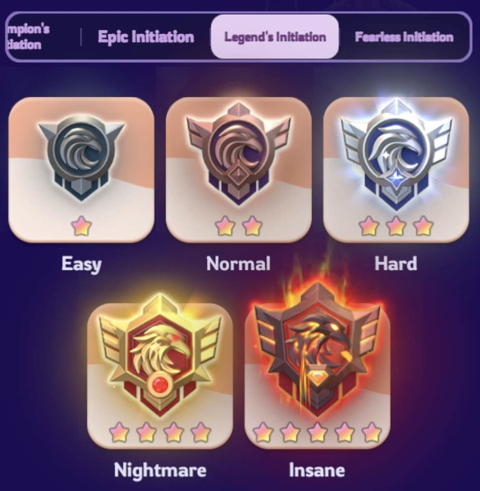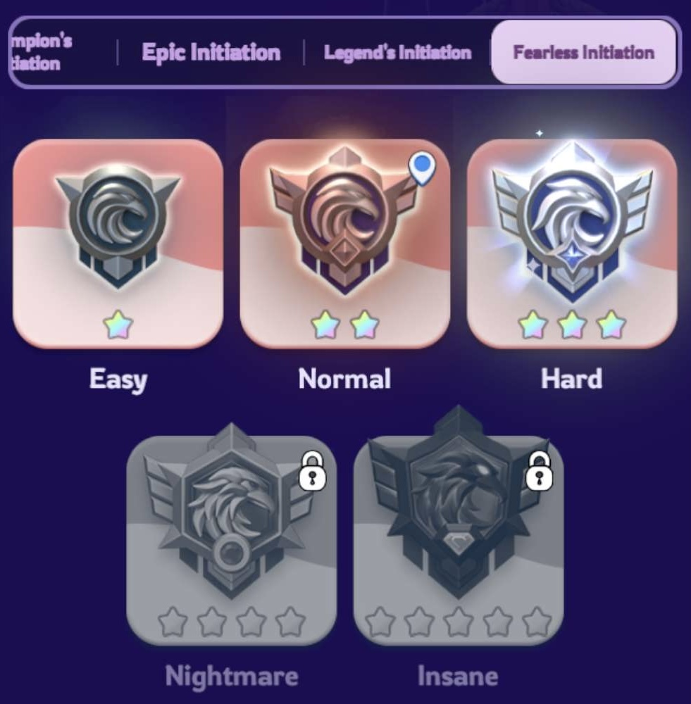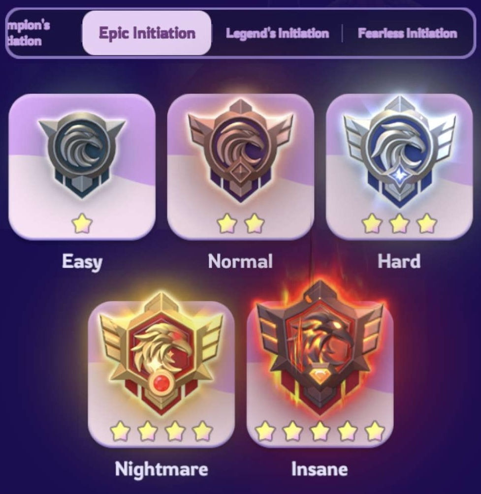 Au début de l’événement, vous choisissez d’abord un niveau de difficulté (Champion, Epique, Legende ou Dangereuse), puis un niveau de difficulté au sein de ce niveau (Facile, Normale, Difficile, Cauchemardesque ou Dément). Les difficultés supérieures à Facile s’obtiennent en terminant le niveau de difficulté précédent lors d’un événement précédent. Vous devrez donc participer à cet événement au moins 20 fois pour débloquer tous les niveaux de difficulté.