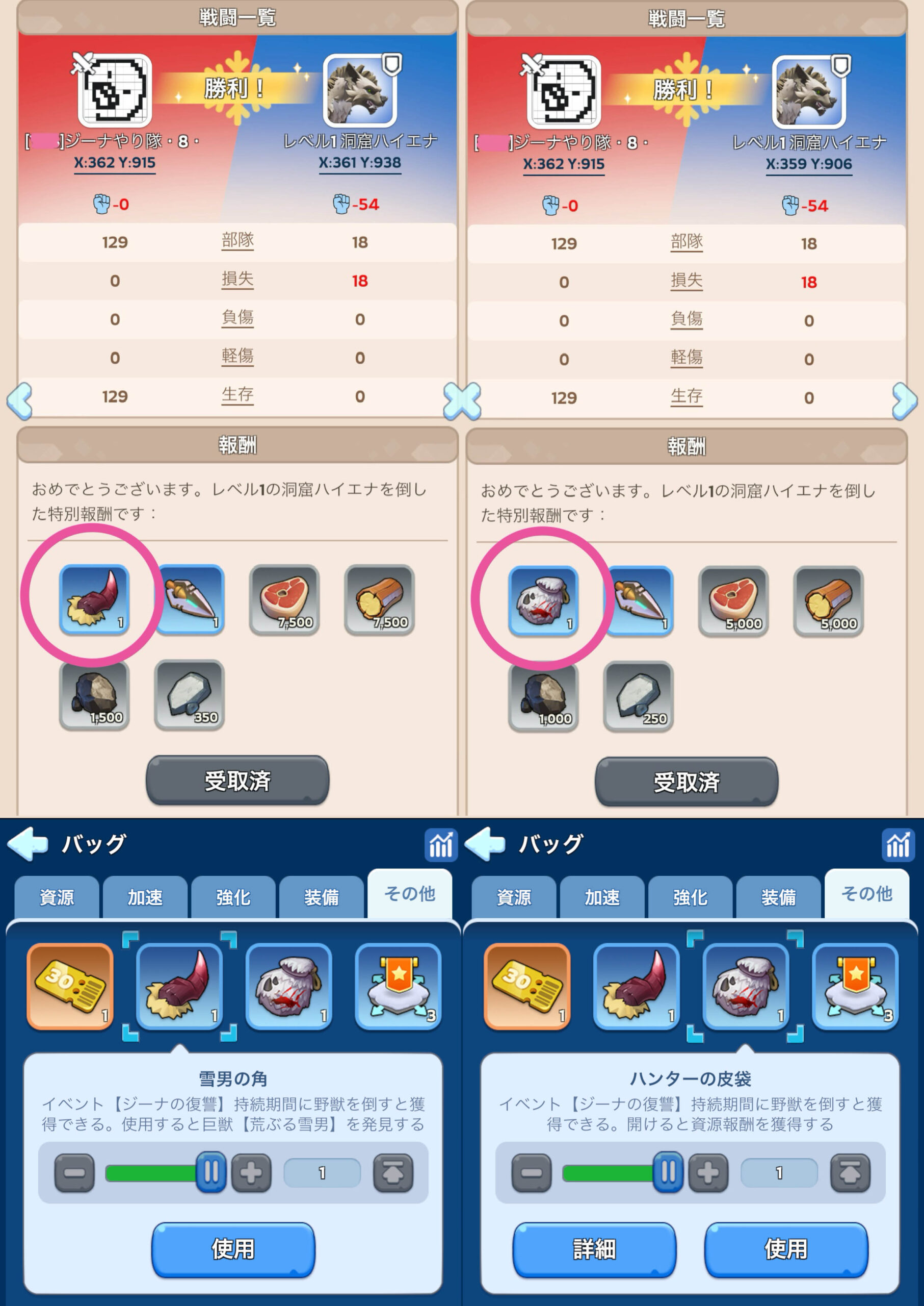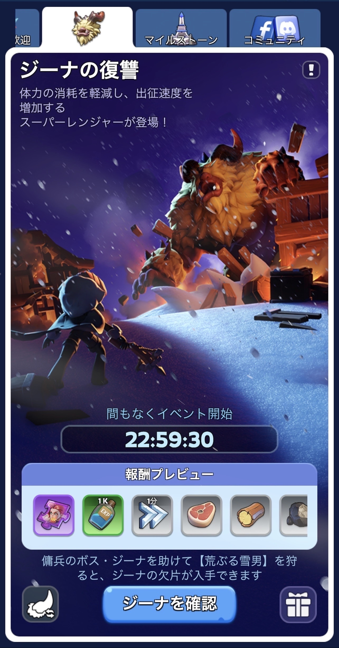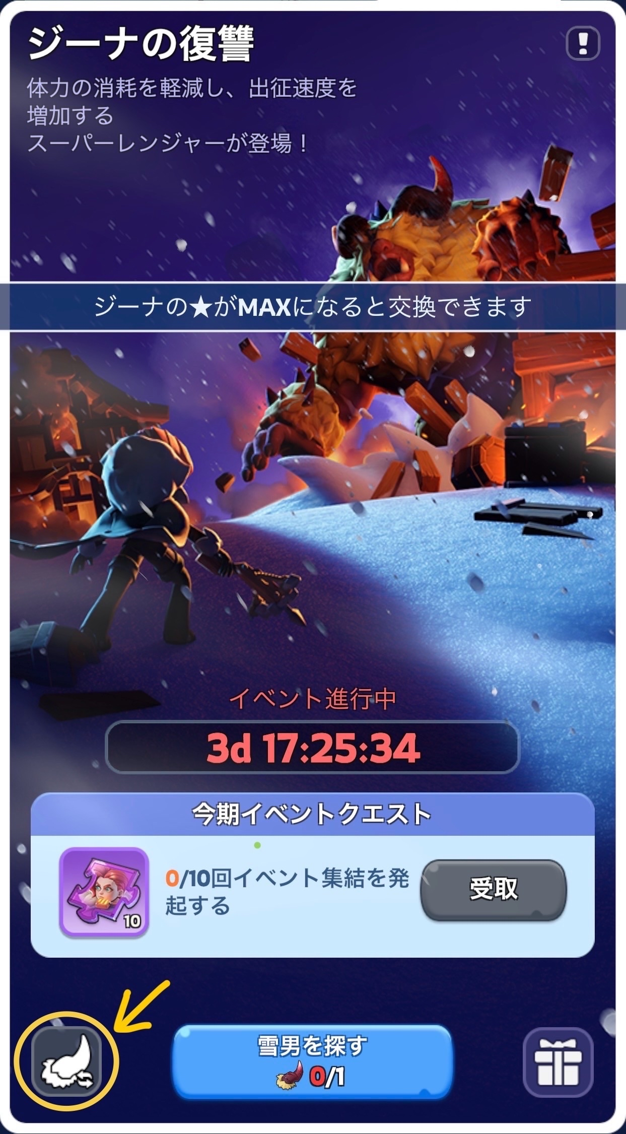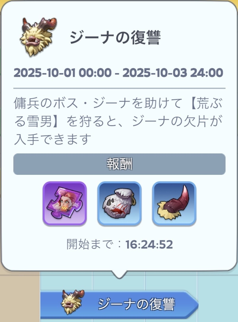 - 野獣を倒す→【雪男の角】を手に入れる→アイテムを使用して暴走雪男を召喚→集結して倒す→SR英雄ジーナの欠片などの報酬を手に入れる