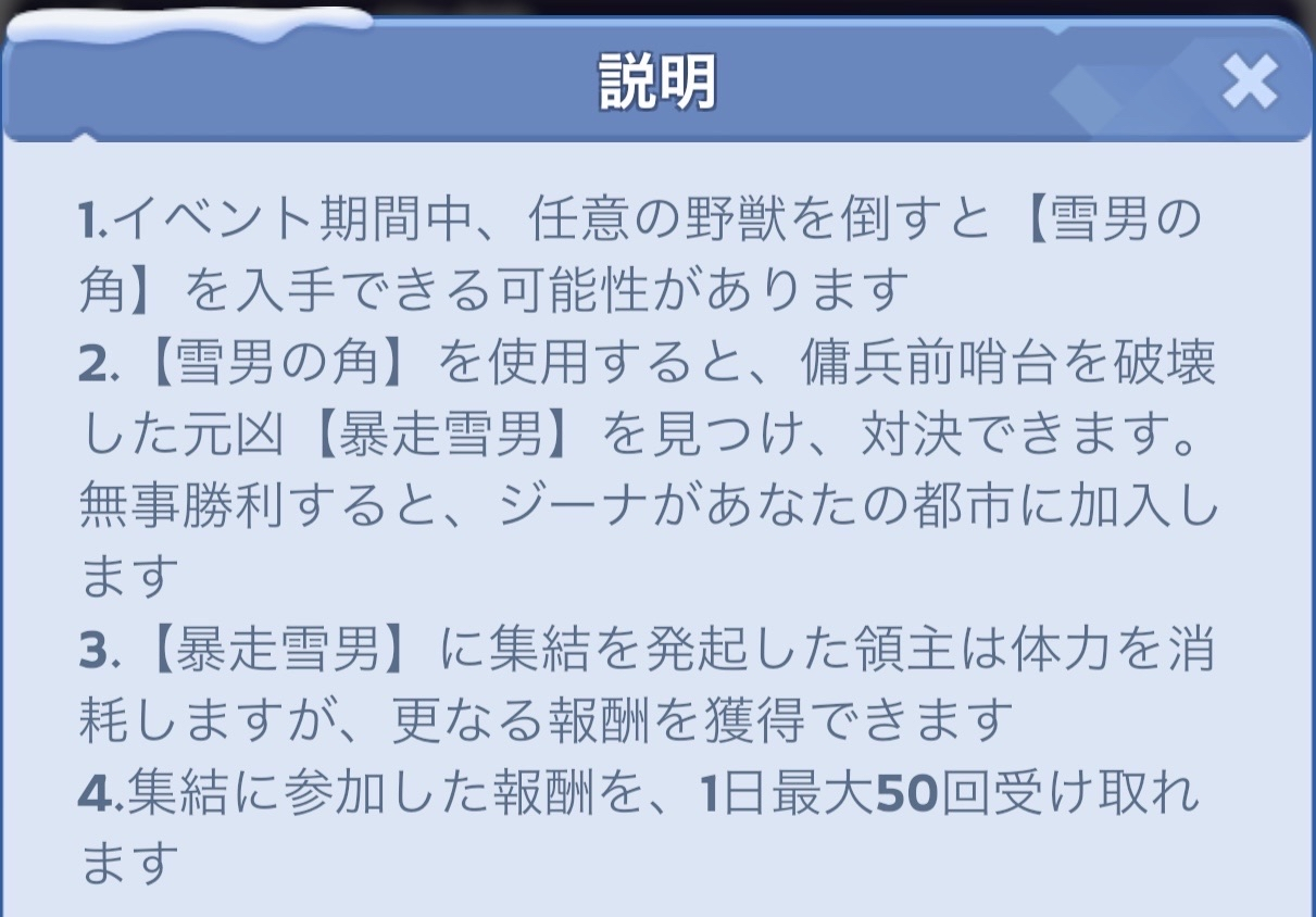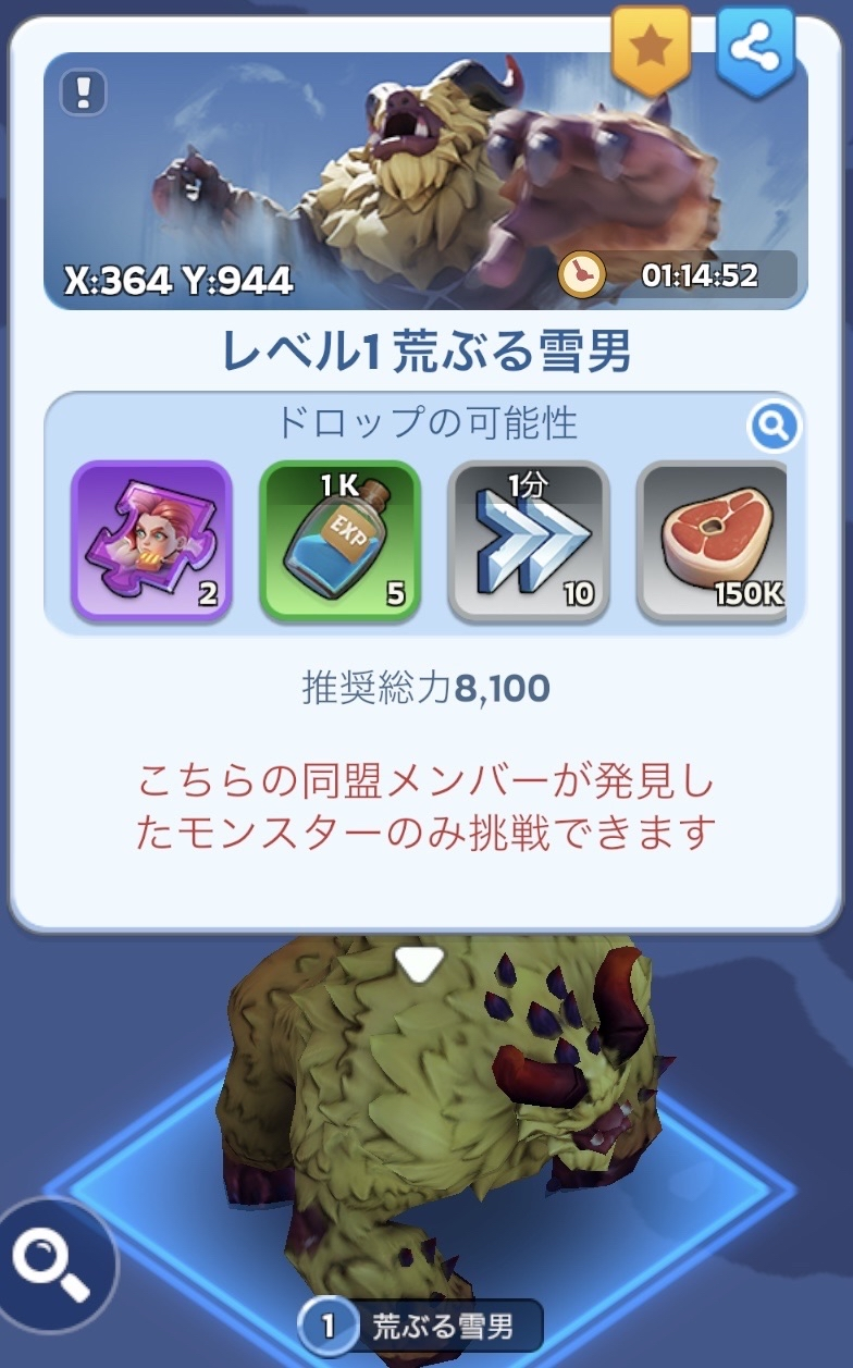 - 同盟メンバーが召喚した荒ぶる雪男には集結をかけることができます。(目視で見つけたり、座標シェアしてもらったりして場所を知ることができます)