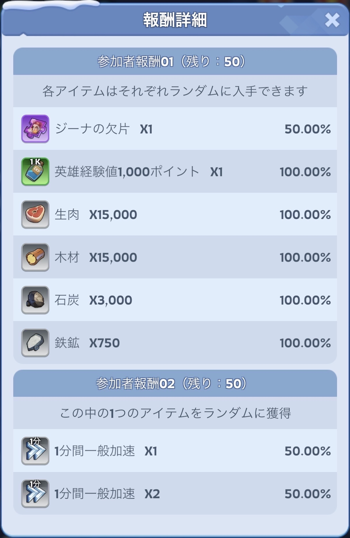 - [参加者報酬02] は一般加速1分/2分のどちらかを獲得できます。