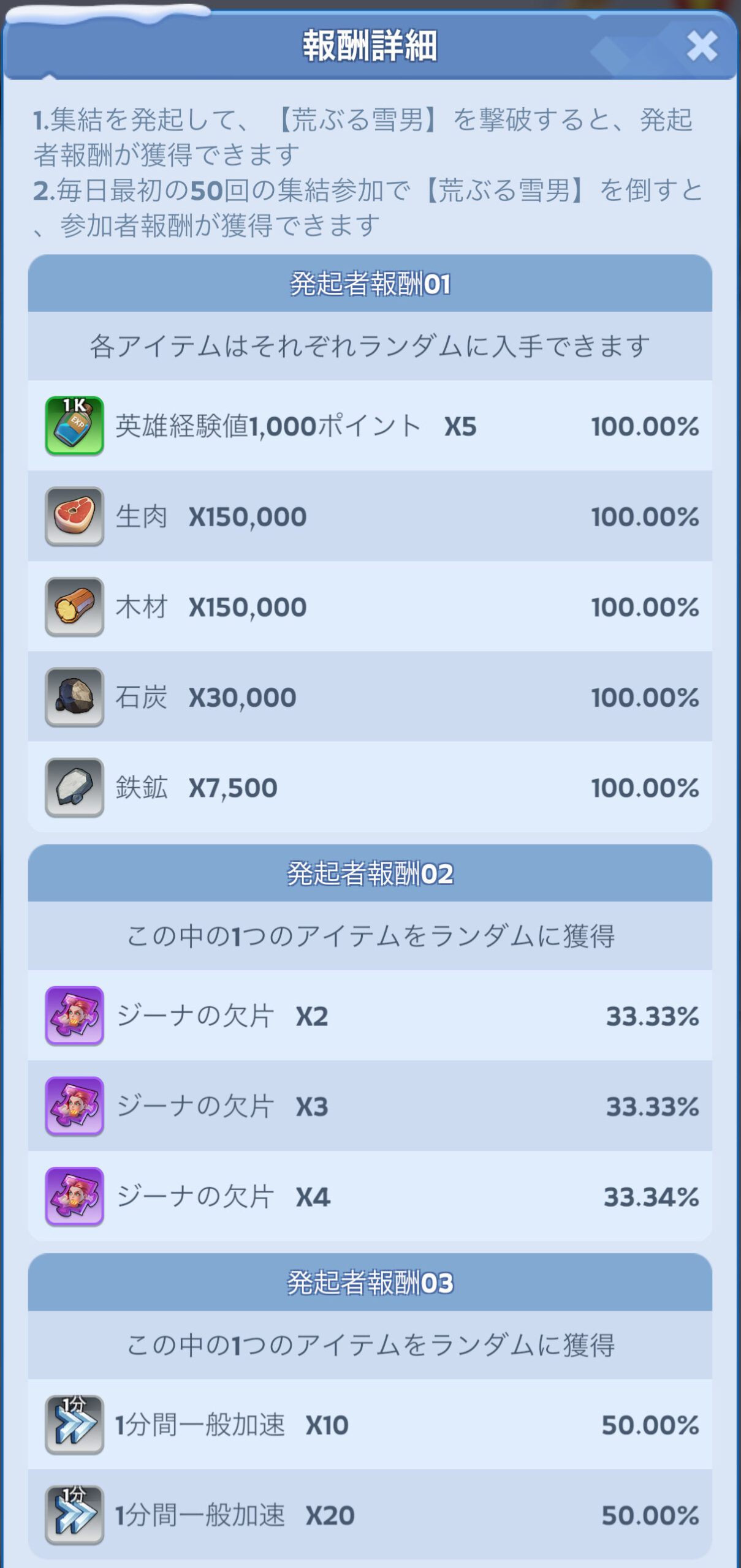 同盟メンバーの集結に参加して荒ぶる雪男を撃破すると、1日50回まで以下の報酬を獲得できます。