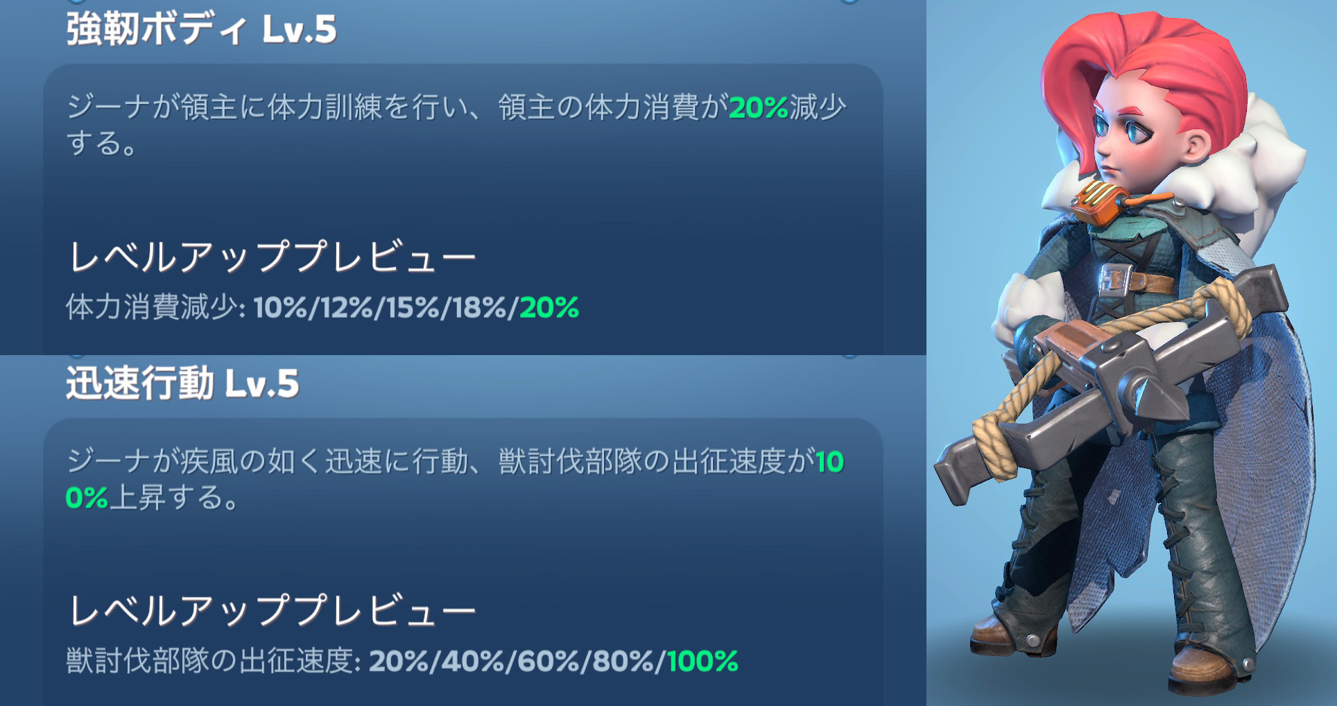 - 強靭ボディ~領主体力消費減少(減少する領主体力の最大は集結では5,ソロ攻撃では2です。)集結に参加する場合は発動しません。