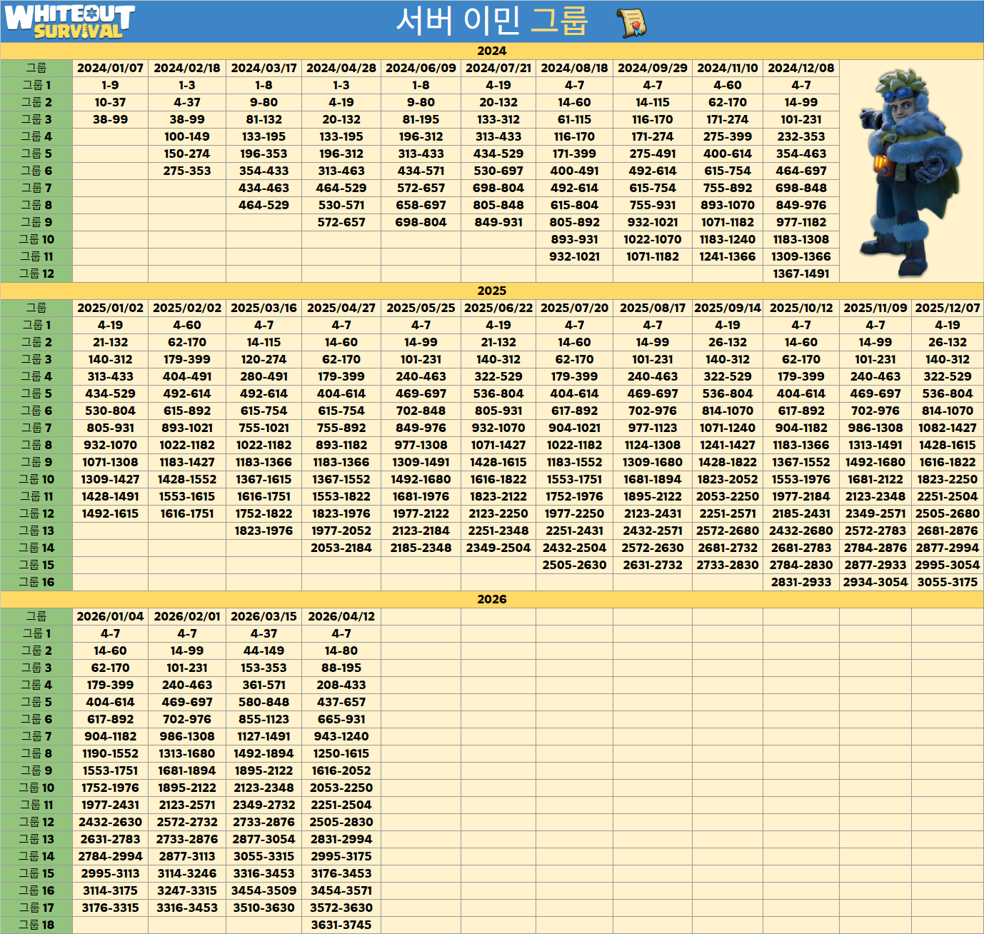 - 위 조건이 만족한 상태에서 현재 캐릭터 생성일이 대상 왕국의 오픈일로 부터 일정 기간 이내여야 합니다. 이 기준일은 대상 왕국의 발전 상황에 따라 달라지며, 최소 90일 ~ 최대 180일 범위 내에서 설정 됩니다.