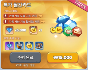 또한 해당 패키지를 구매후 활성화된 상태에서만 “자동 사냥”을 잠금 해제 할 수 있으며 게임에 로그인되어 있는 동안 자동으로 야수를 사냥할 수 있습니다.