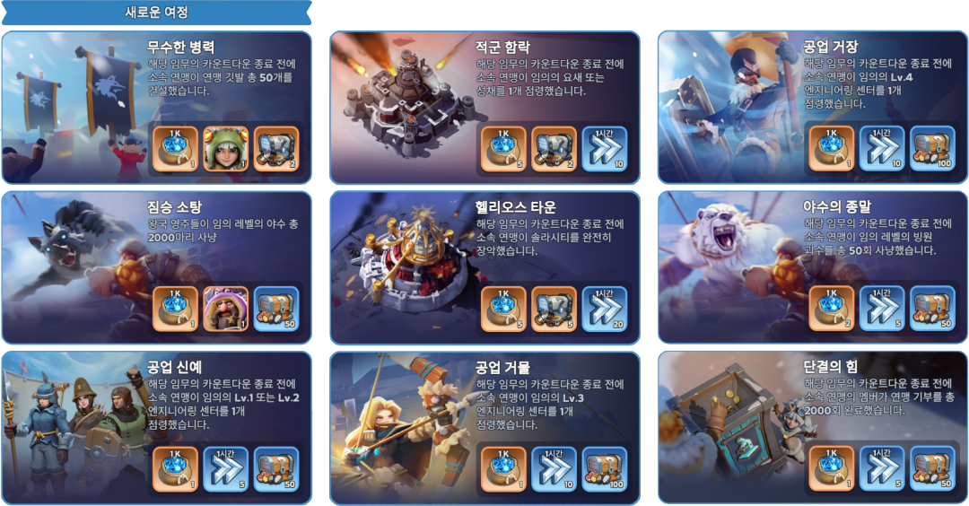 영주님의 연맹은 다음과 같은 새로운 미션을 완료 하여야 합니다.