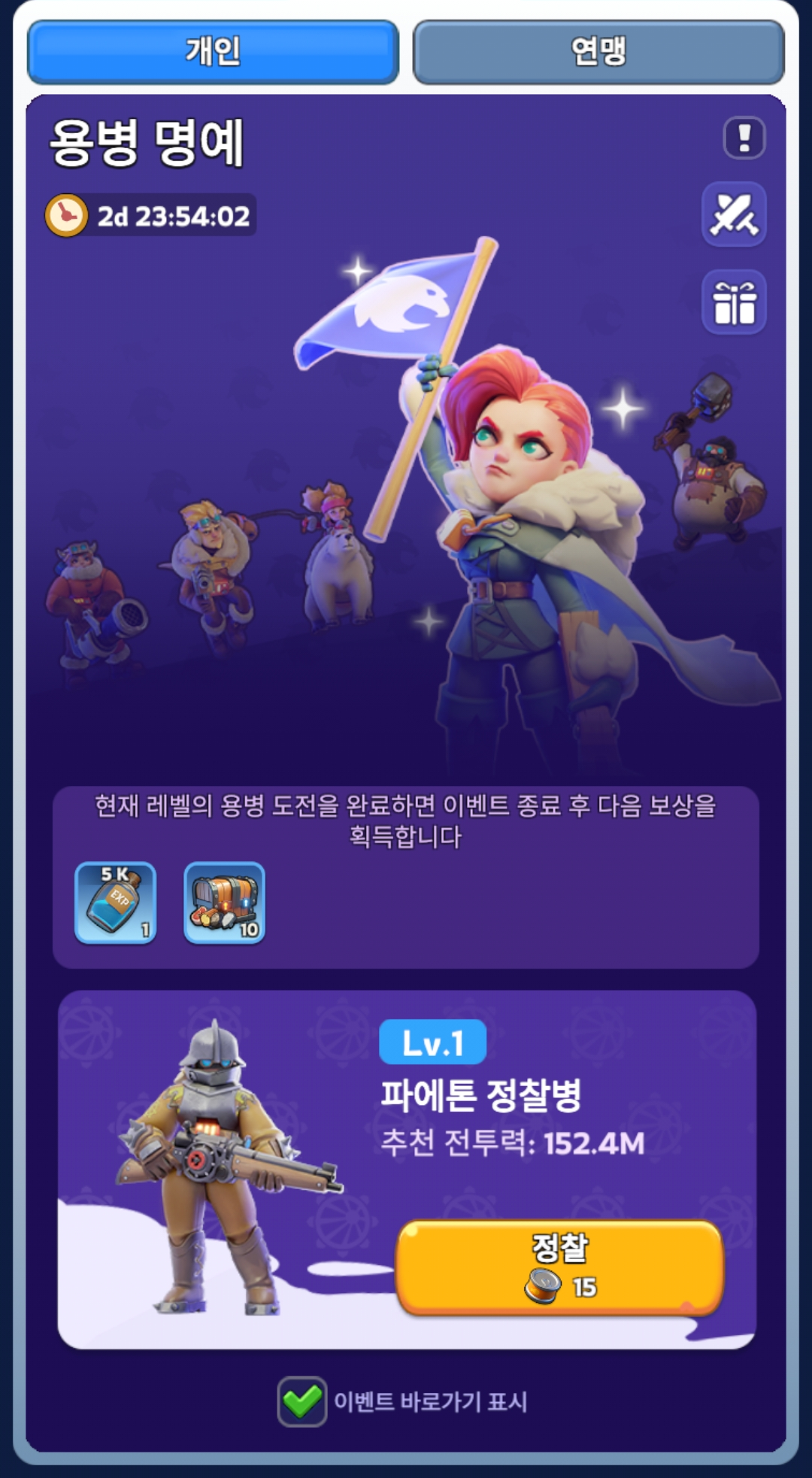 용병 명예는 개인 도전과 동맹 도전 두가지로 나뉘어 진행이 됩니다.