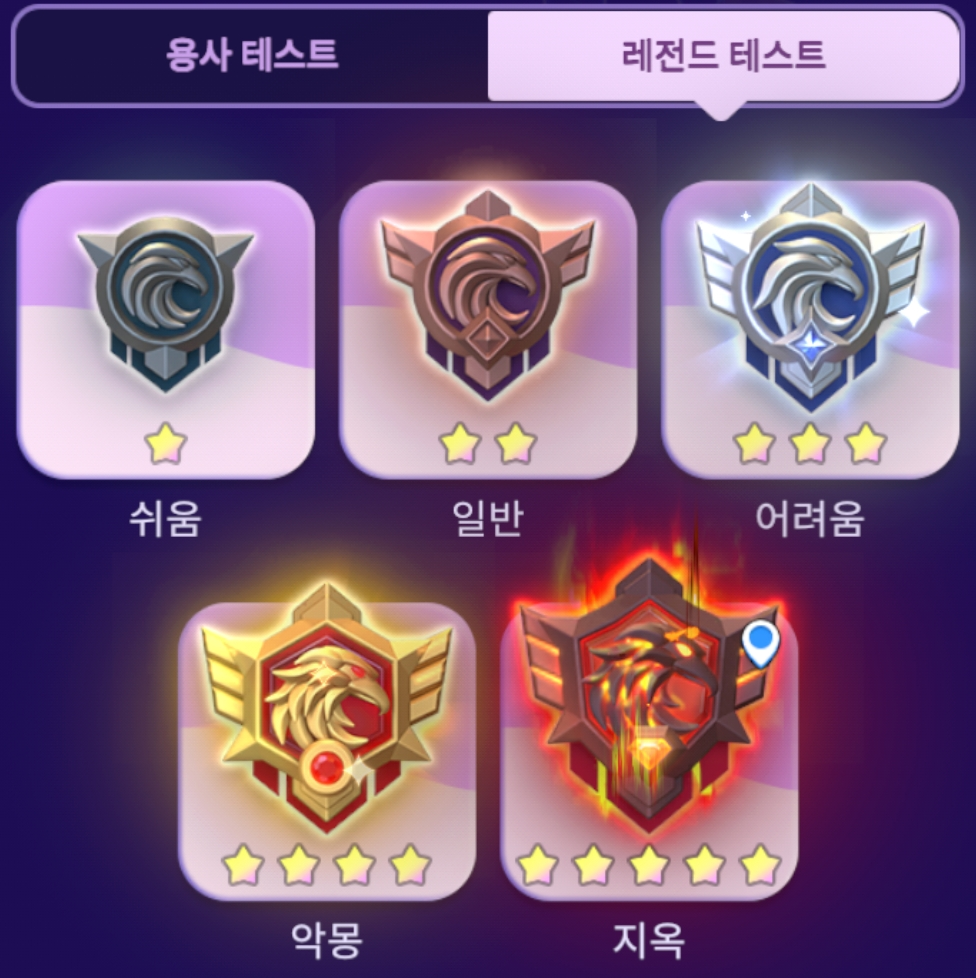 (용사 테스트와 레전트 테스트로 나뉘며 해당 테스트 내에 난이도는 쉬움, 일반, 어려움, 악몽, 지옥으로 구분)