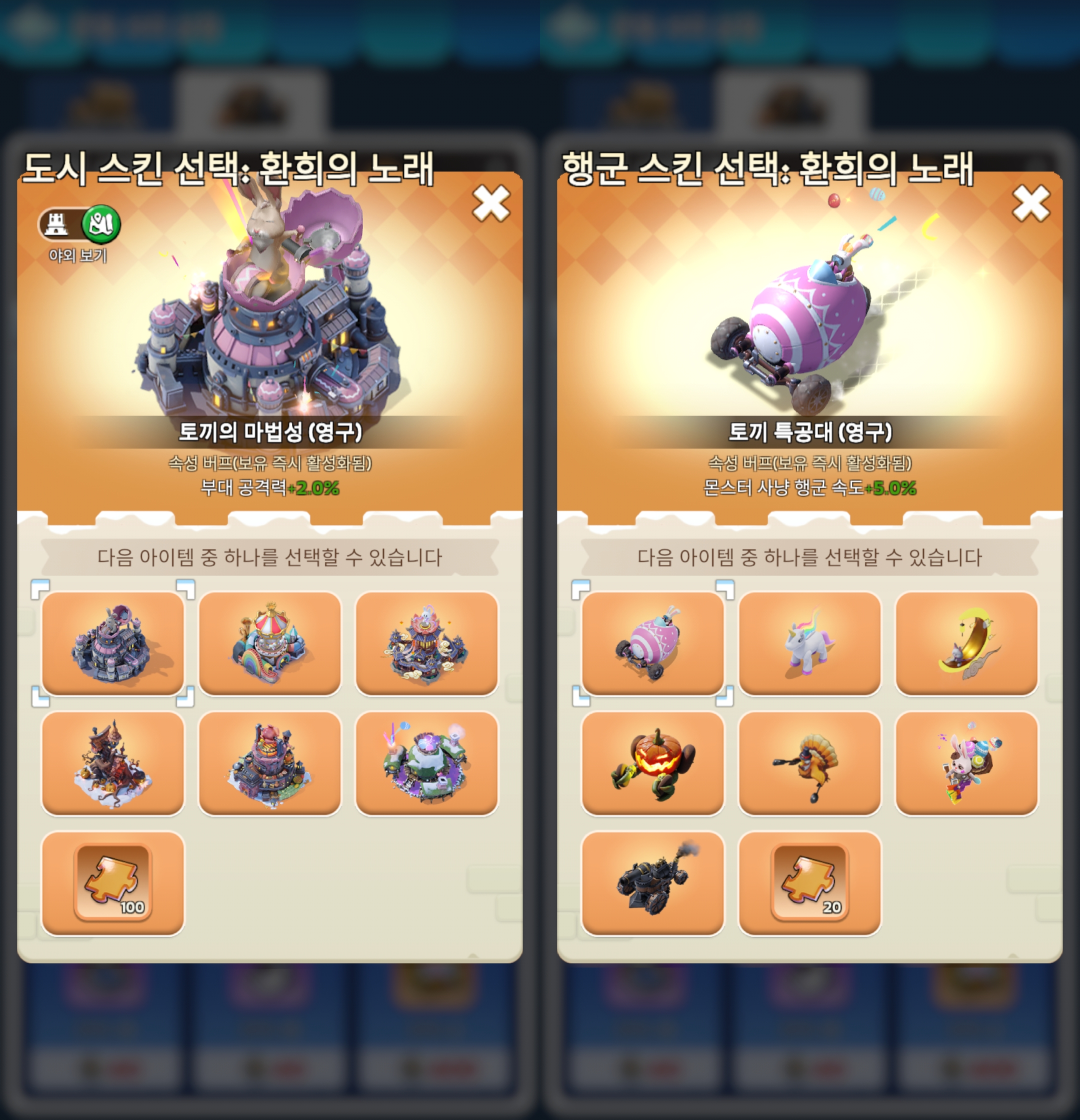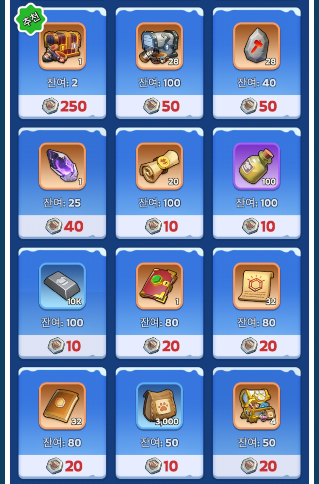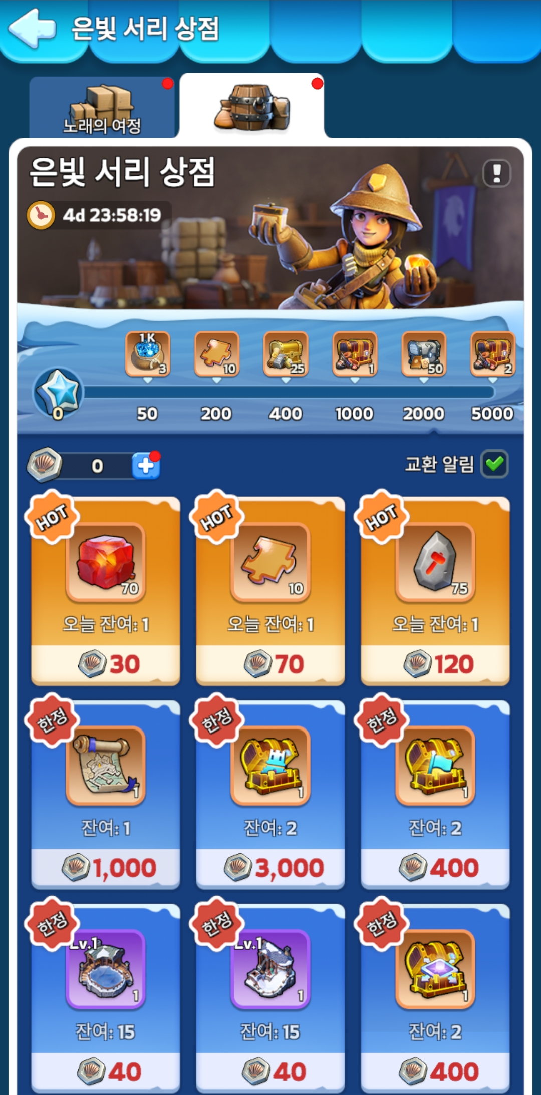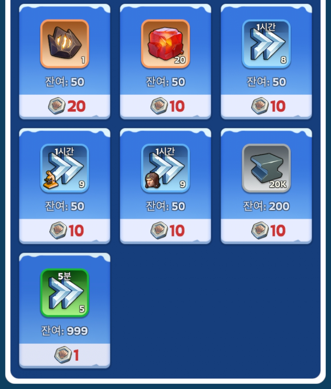 한정 아이템(햇살섬 장식품, 도시 스킨, 행군 스킨, 도시 이전 스킨)을 은조개를 통해 구매하실 수 있습니다.