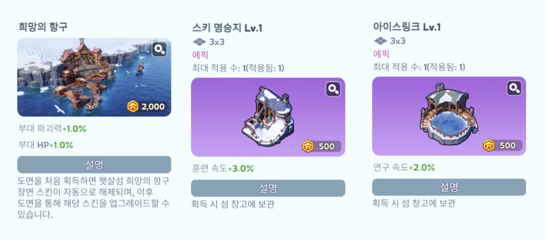 – 희망의 항구 : HP, 파괴력 각 1~10% 증가 – 아이스링크 : 연구 속도 2~10% 증가 – 스키 명승지 : 훈련 속도 3~15% 증가