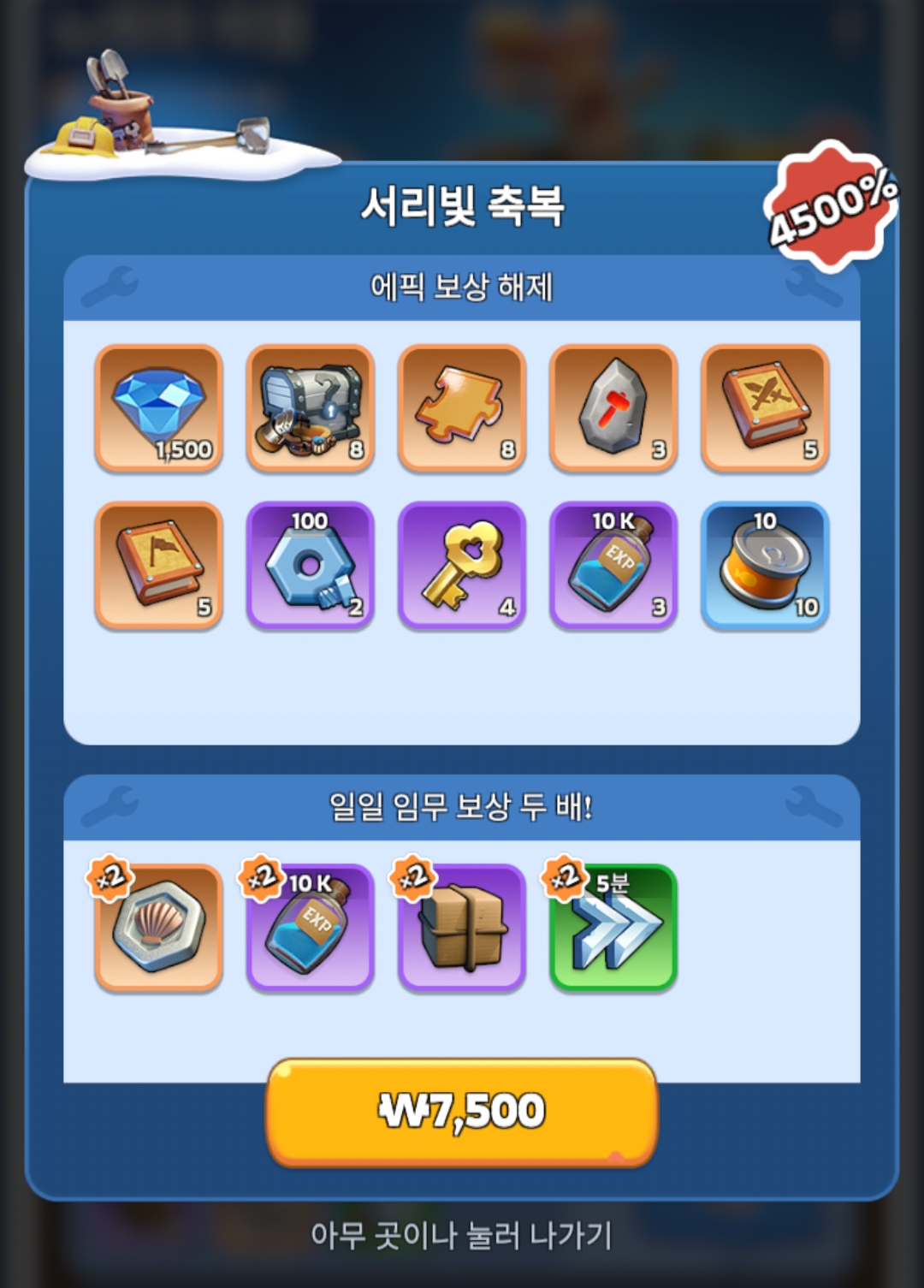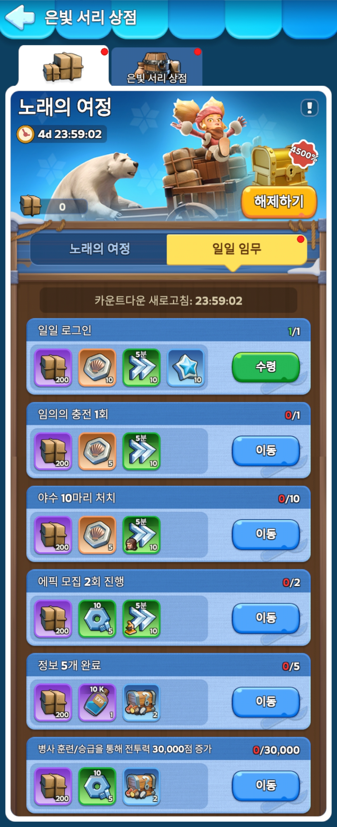 - 서리빛 축복 패키지 구매를 통해 일일 임무 보상을 2배로 받으실 수 있습니다.