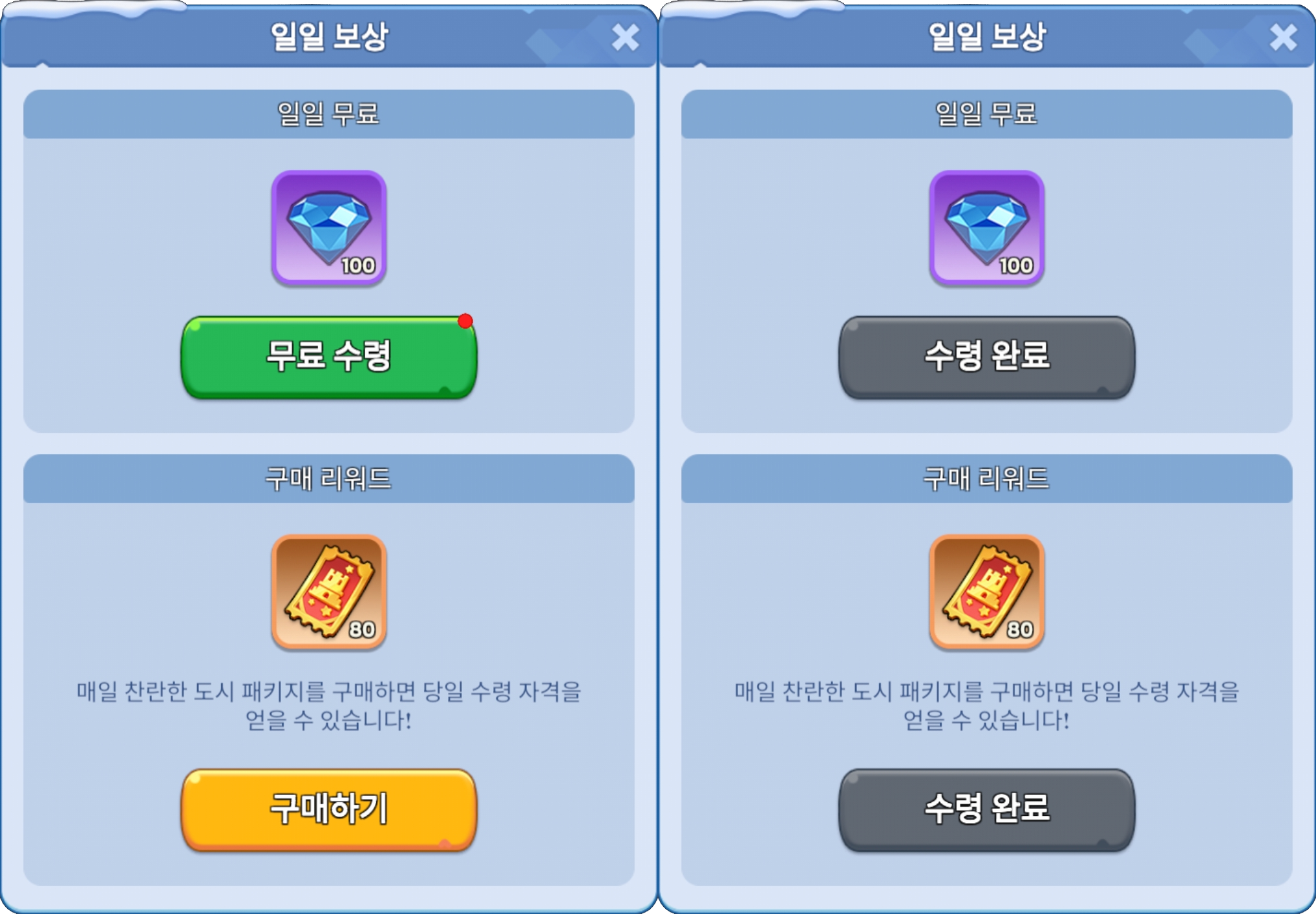 ● 매일 찬란한 도시 패키지를 구매하면 매일 구매 리워드로 찬란한 증거를 80개 수령하실 수 있습니다.