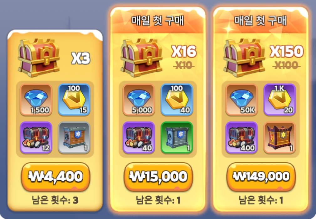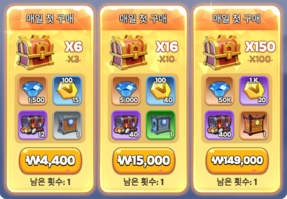 → 매일 각 등급별 첫 구매 이후에는 첫번째,두번째 등급 패키지는 각각 최대 3회, 세번째 등급 패키지는 최대 5회까지 추가 구매가 가능합니다.