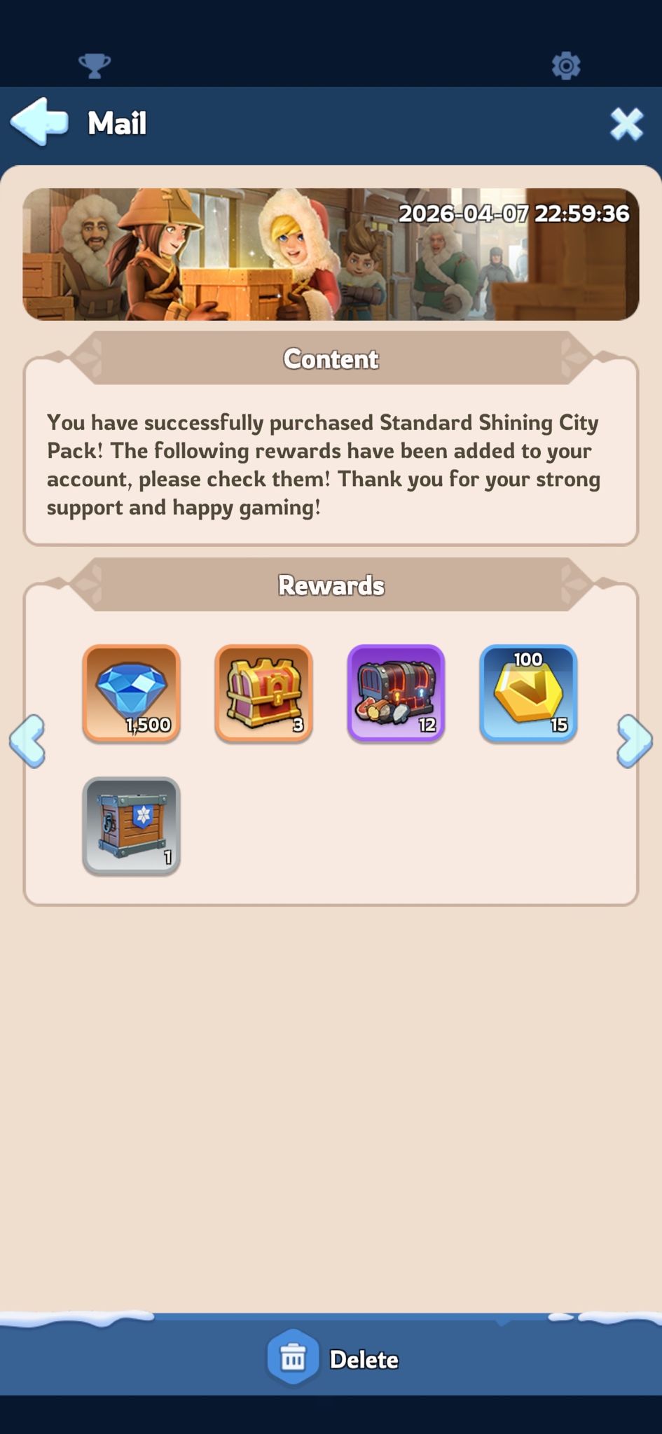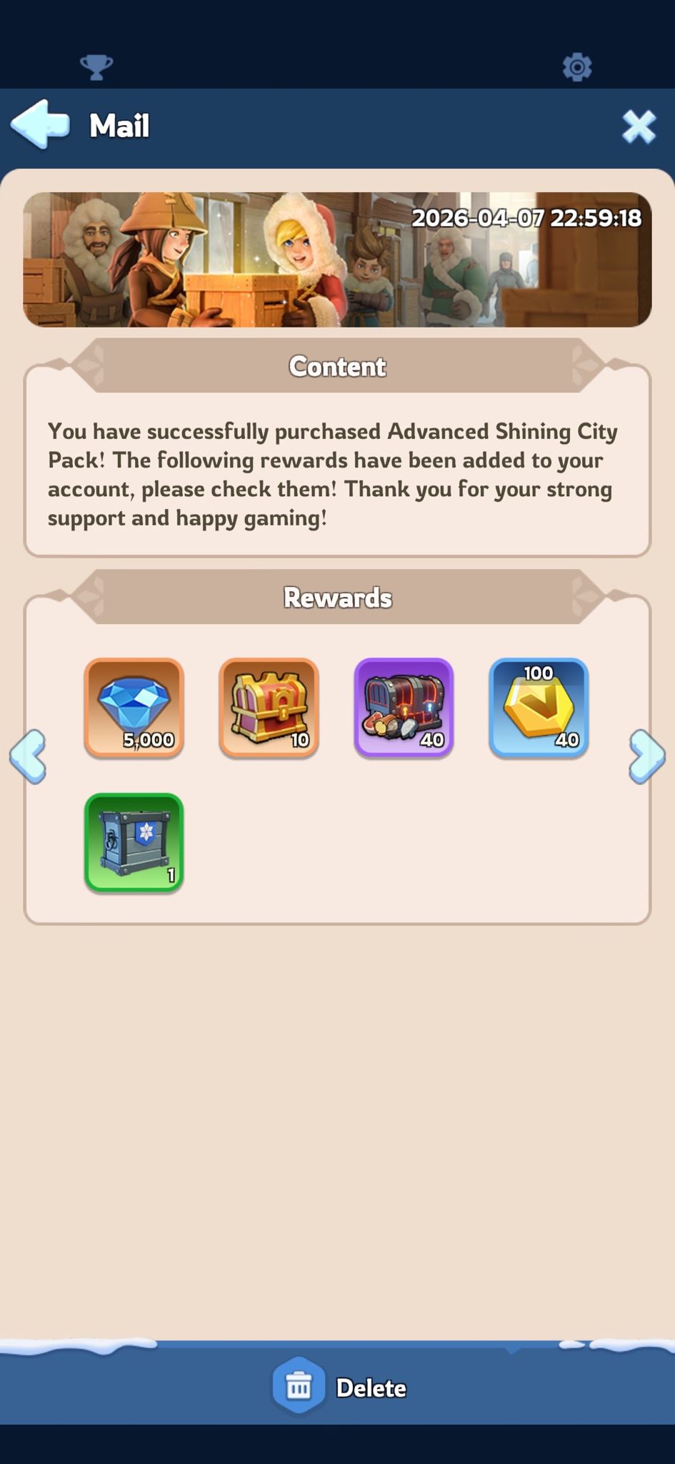 ● 찬란한 도시 패키지를 구매하면 찬란한 증거 행운 보물상자를 획득합니다. 보물상자를 오픈하면 랜덤으로 찬란한 증거(5~100)를 획득합니다. 찬란한 증거를 사용하면 기간 한정 교환 상점에서 도시 스킨, 기타 아이템 또는 자원으로 교환할 수 있습니다.