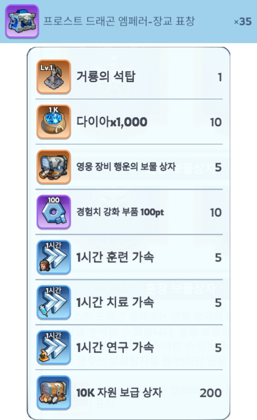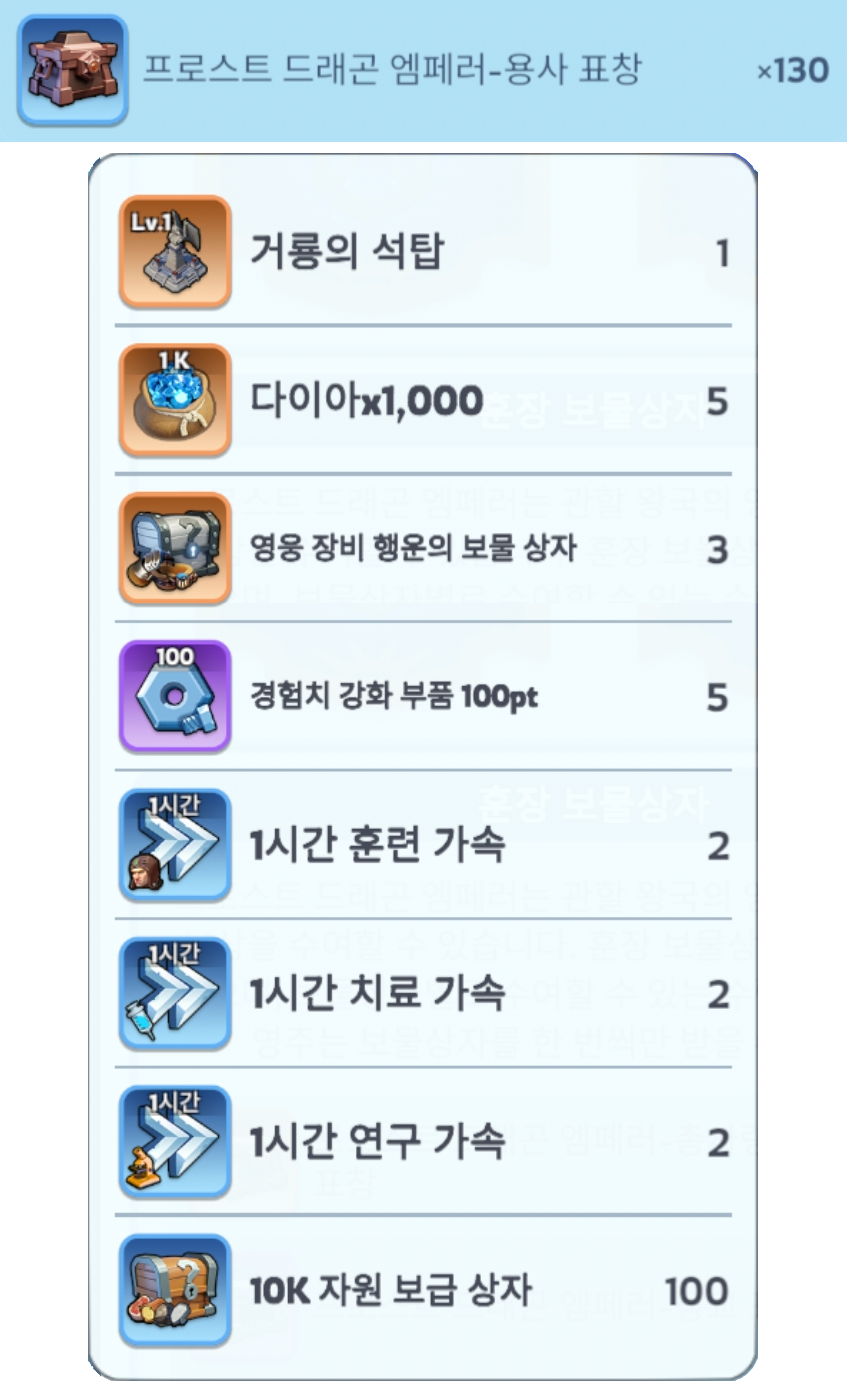 프로스트 드래곤 엠페러는 관할 왕국의 영주에게 보물상자 보상을 수여할 수 있습니다. 훈장 보물상자에는 3종류가 있으며, 보물상자별로 수여할 수 있는 수량이 다릅니다. 각 영주는 보물상자를 한 번씩만 받을 수 있습니다.