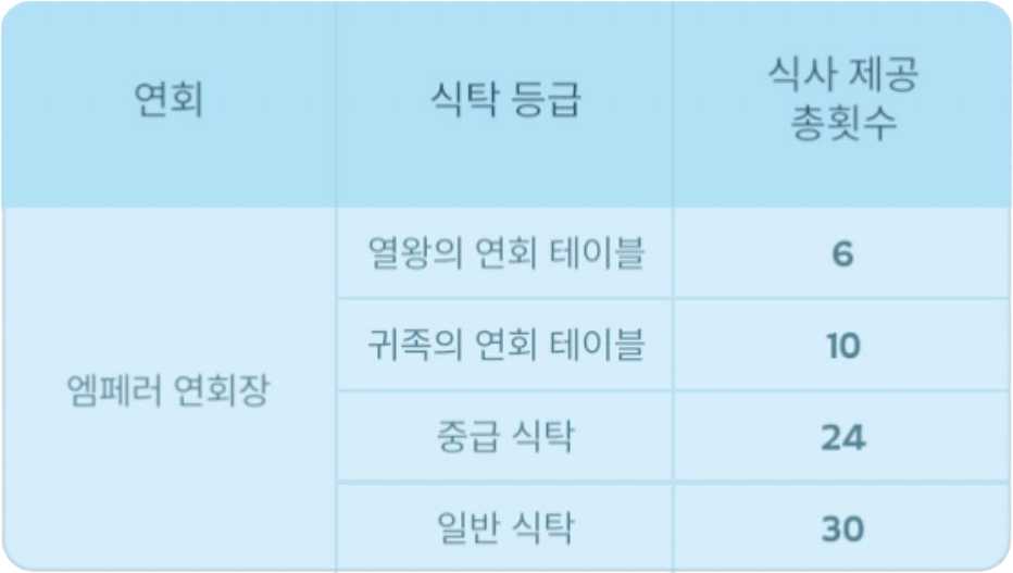 연회 기간에 엠페러는 연회를 1회씩만 개최할 수 있으며, 연회는 중단 없이 1시간 동안 진행되며 취소할 수 없습니다.
