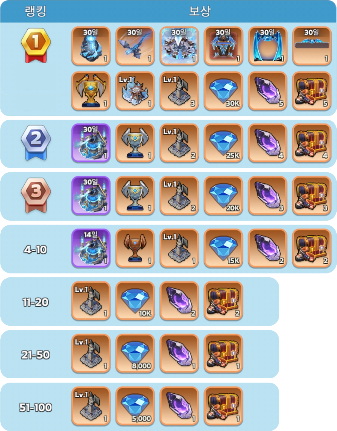 프로스트 드래곤 캐슬 개인 점령 시간에 따라 랭킹이 정해지며, 해당 랭킹 보상이 발송됩니다. (프로스트 드래곤 캐슬 쟁탈전이 끝나면 우편으로 발송됨)