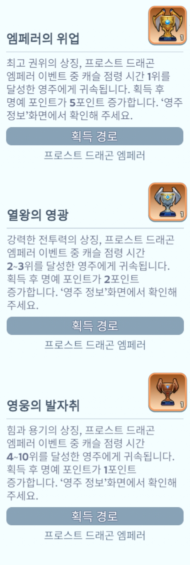 프로스트 드래곤 캐슬 누적 점령 시간이 가장 긴 영주는 해당 구역 최고의 프로스트 드래곤 엠페러가 되어 영광과 특권을 누릴 수 있습니다 (임기 : 30일)