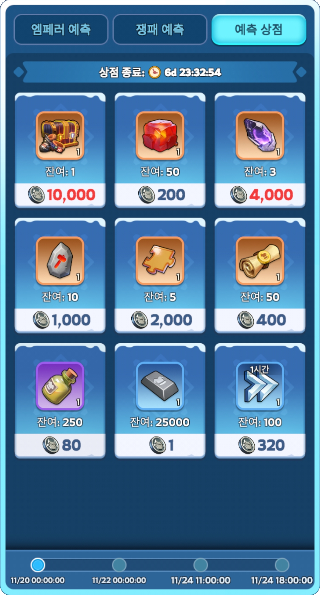 참고 : 프로스트 드래곤 선물(무료)와 특가 용 비늘 수정 패키지(HOT)은 매일 새로고침 되며 나머지 패키지는 새로고침 되지 않으며 이벤트가 끝날때까지 최대 횟수까지 구매가 가능합니다.