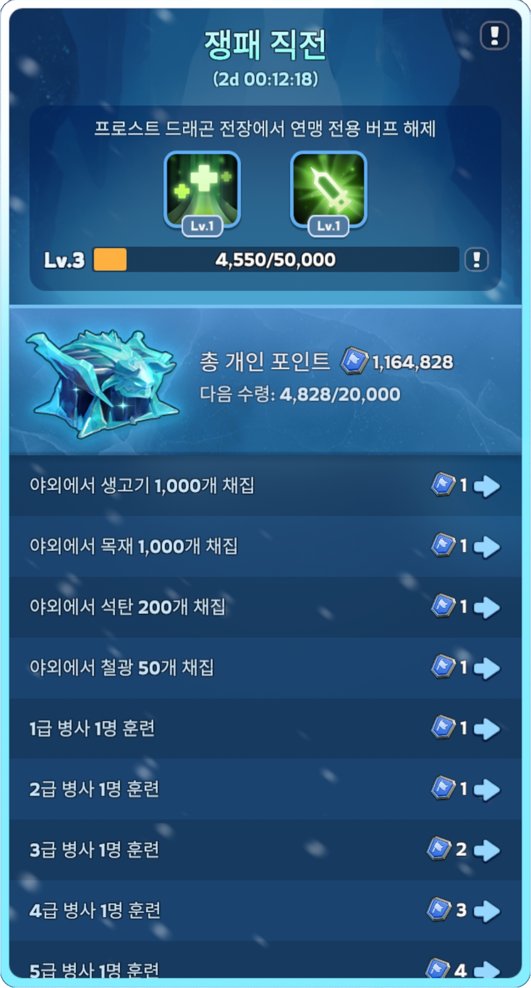 Lv1 : 50.000 연맹 준비 포인트 프로스트 드래곤 전장 내 연맹 멤버의 의부실 치료 속도가 100% 증가