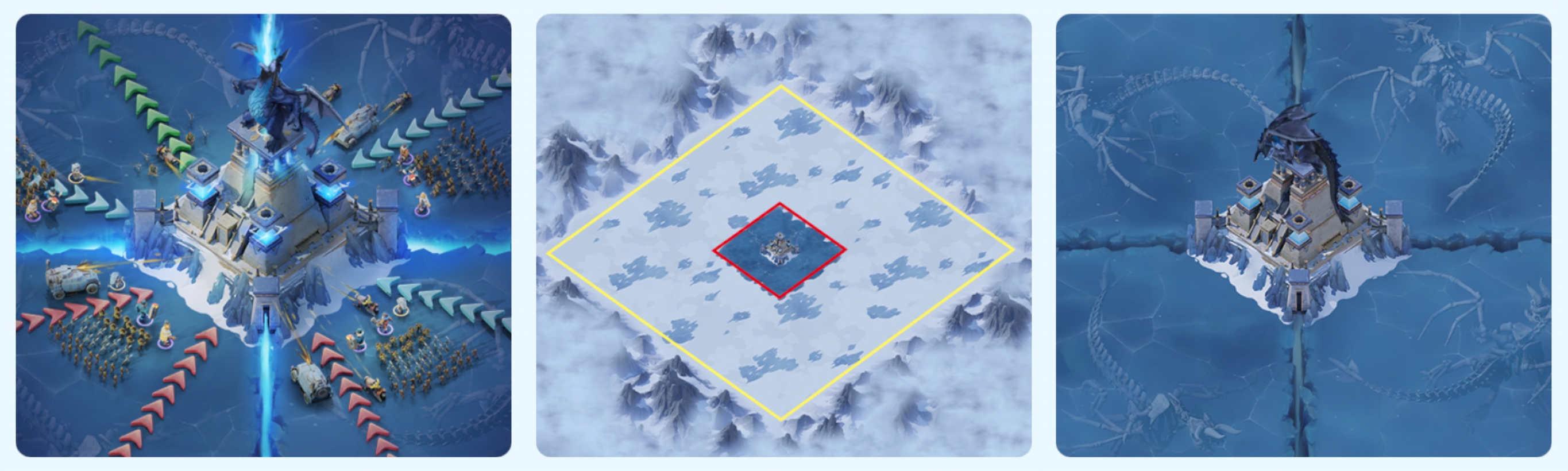 프로스트 드래곤 전장은 용총(빨간 선 안쪽)과 국경지대(노란 선 안쪽) 두 구역으로 나뉩니다. 전장에 입장하면 도시가 국경 지대의 랜덤 위치에 나타납니다. 용총 구역에 입장하면 보호막을 실행할 수 없습니다. 보호막을 실행한 상태로 용총에 입장하면 보호막이 사라지며, 용총 구역에 위치한 도시는 방어 실패시 국경 지대의 랜덤 위치로 이전 됩니다.