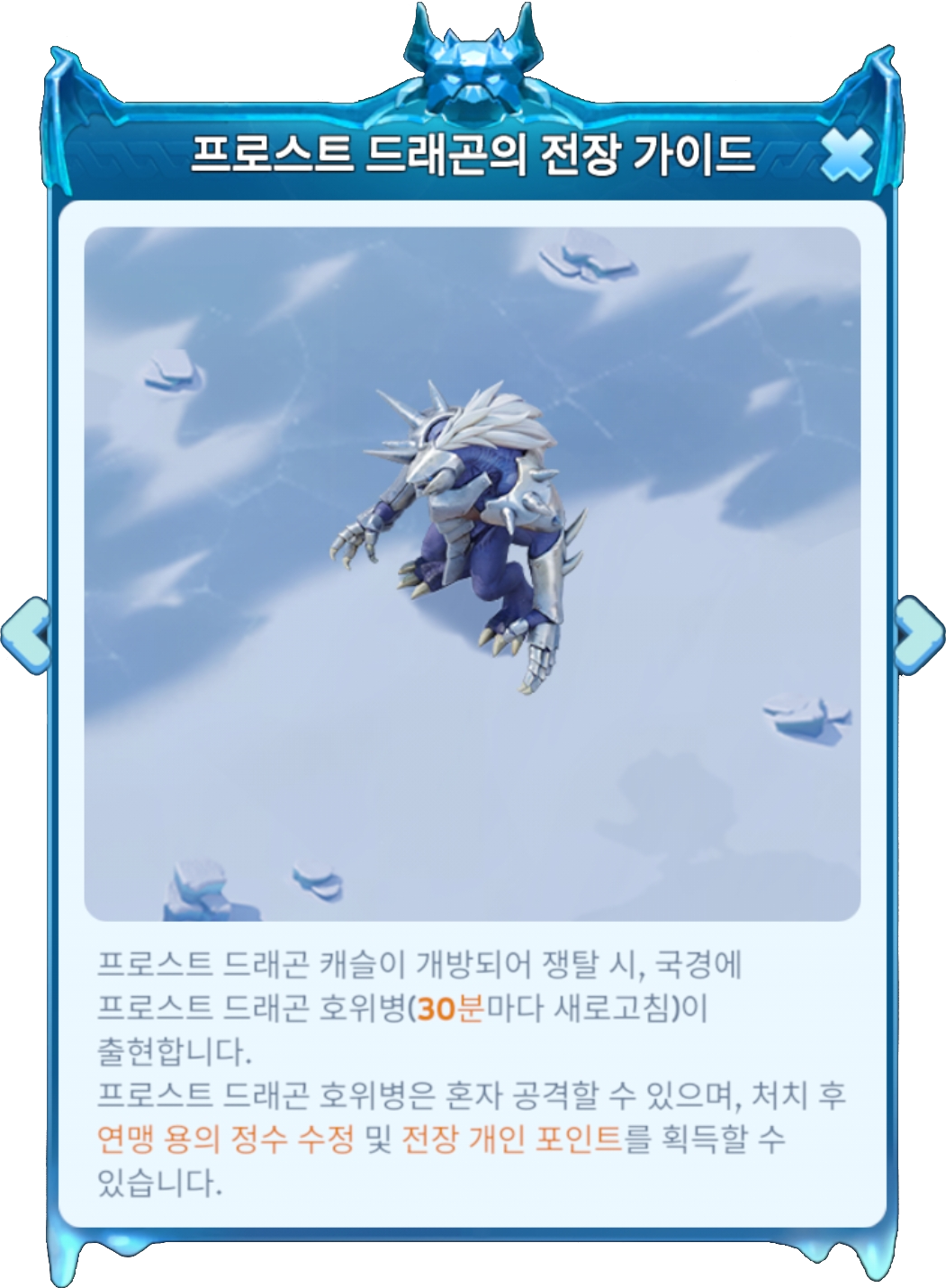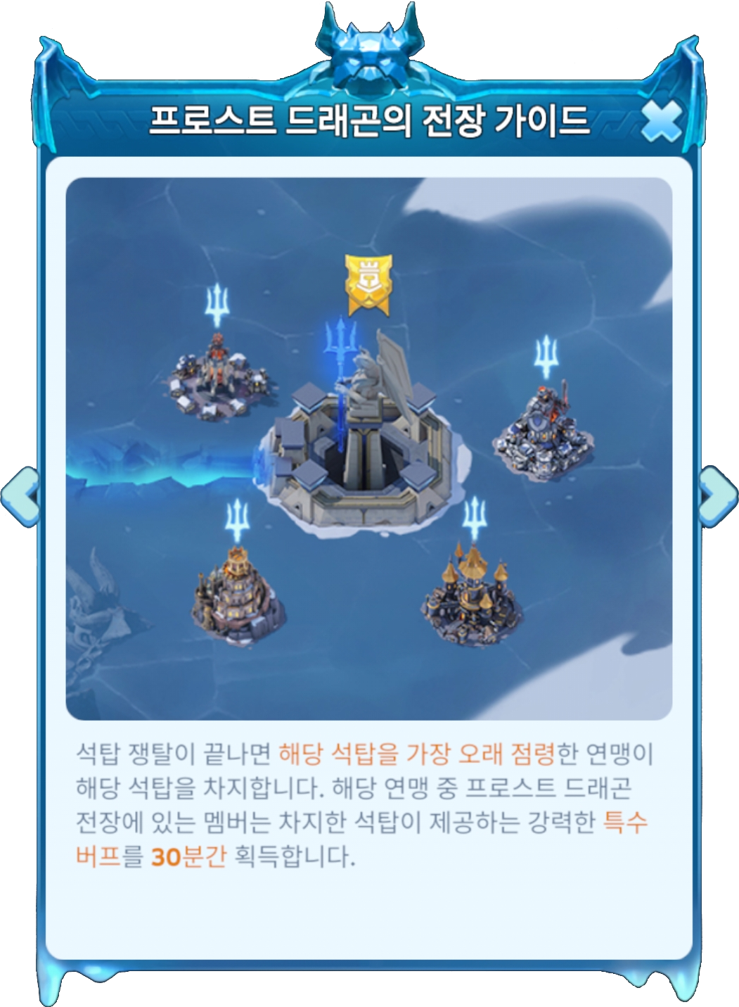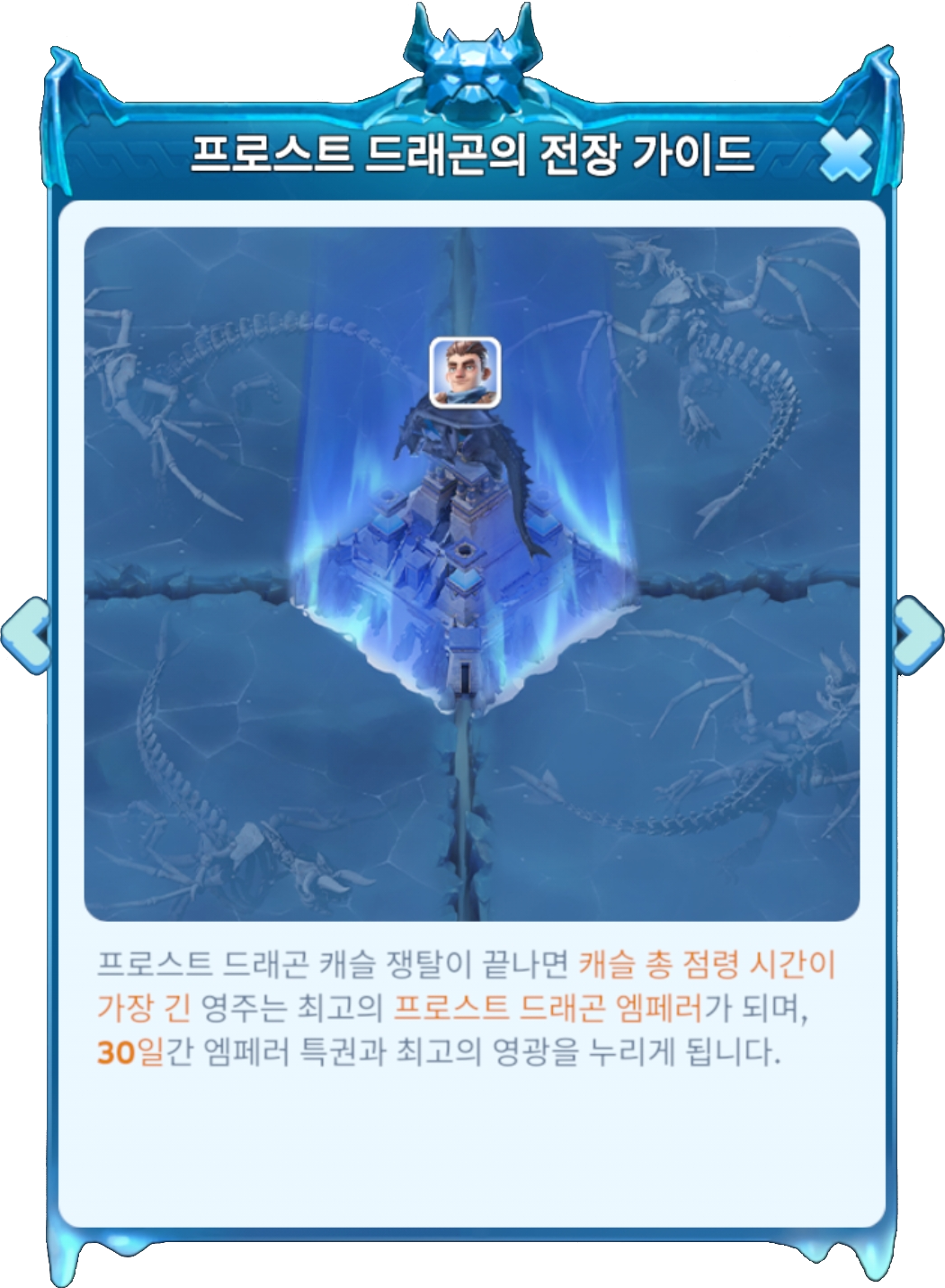 프로스트 드래곤 캐슬 누적 점령 시간이 가장 긴 영주는 해당 구역 최고의 프로스트 드래곤 엠페러가 되어 영광과 특권을 누릴 수 있습니다 (임기 : 30일)