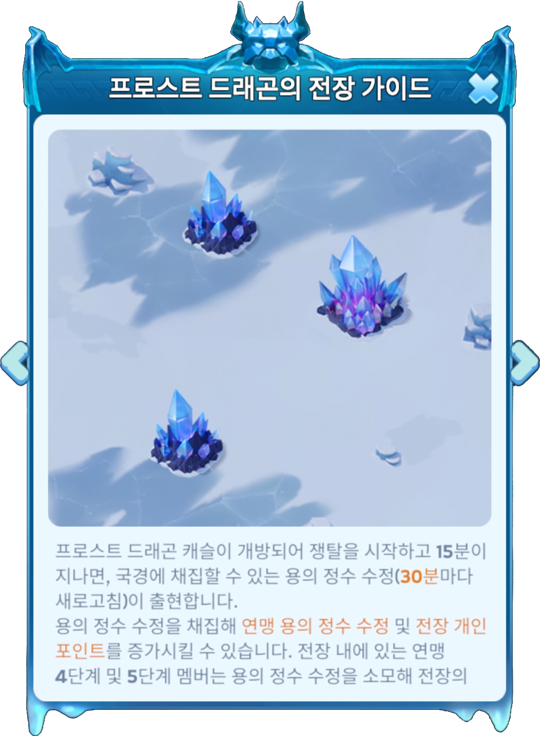 프로스트 드래곤 전장에서 아주 중요한 자원입니다. 강력한 동맹 수정 스킬을 배치하여 중요한 순간에 전투의 흐름을 바꿀 수 있습니다.