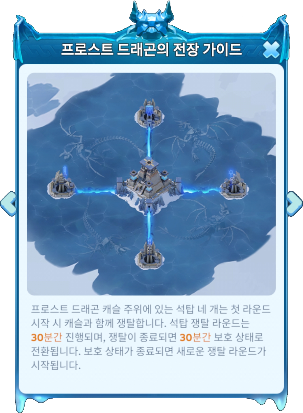 전장 한가운데 있는 오래된 캐슬에는 전설 속 서리용이 살고 있습니다. 캐슬 내부는 성의 근위대가 지키고 있으며, 외부에는 강력한 에너지가 담긴 석탑 4개가 지키고 서 있습니다. 전장 오픈 1시간 후 쟁탈이 시작되며, 캐슬을 가장 오랫동안 점령한 영주가 최고의 프로스트 드래곤 엠페러가 됩니다.