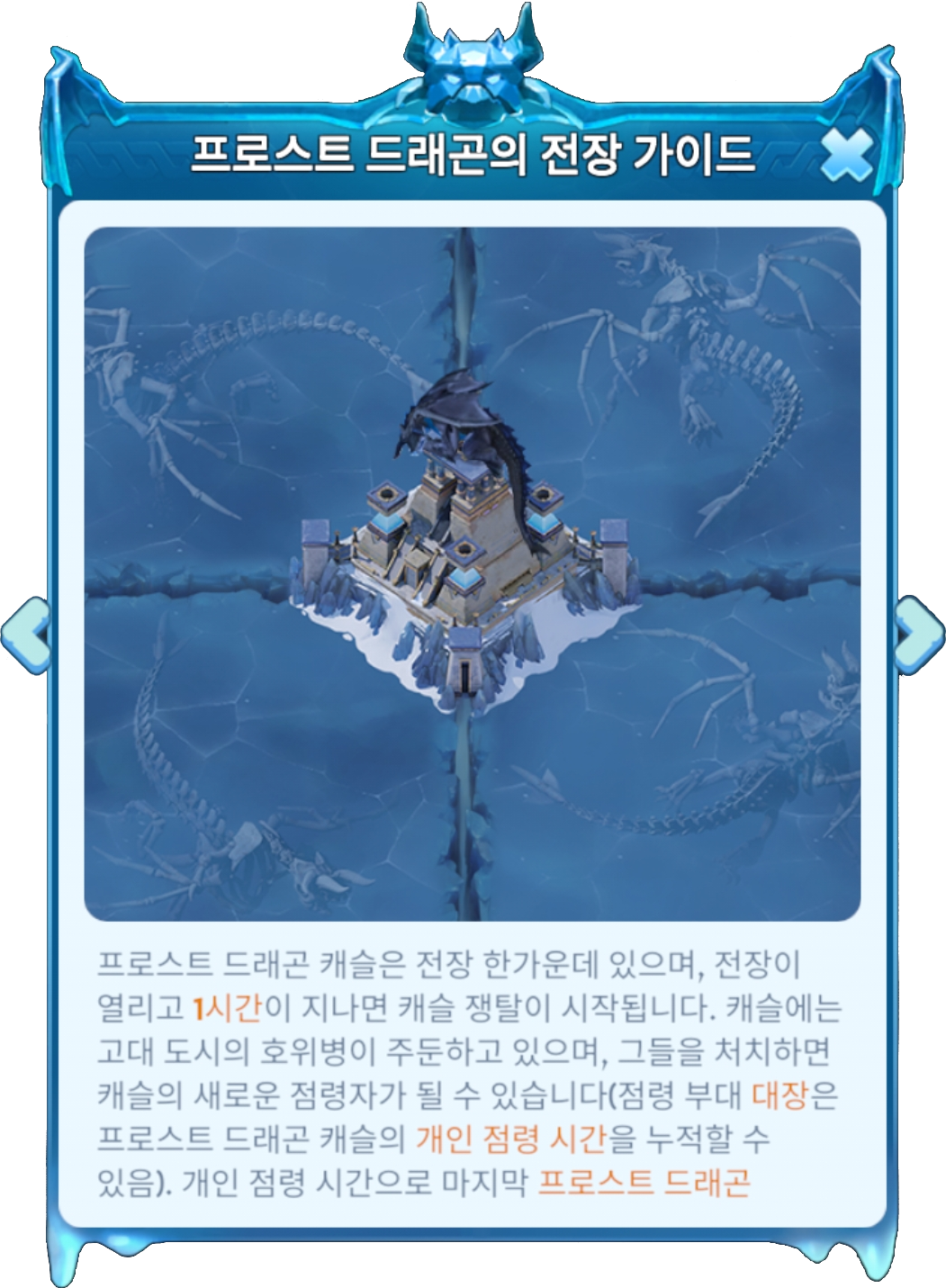 캐슬은 지도의 중앙에 위치해 있으며 전장 오픈 1시간 후 쟁탈이 시작됩니다. 쟁탈이 끝나면 캐슬 총 점령 기간이 가장 긴 영주가 본 구역 최고의 프로스트 드래곤 엠페러가 됩니다. 프로스트 드래곤 캐슬은 점령한 부대에서 대장의 점령 시간만 계산되며, 다른 멤버의 점령 시간은 계산되지 않음