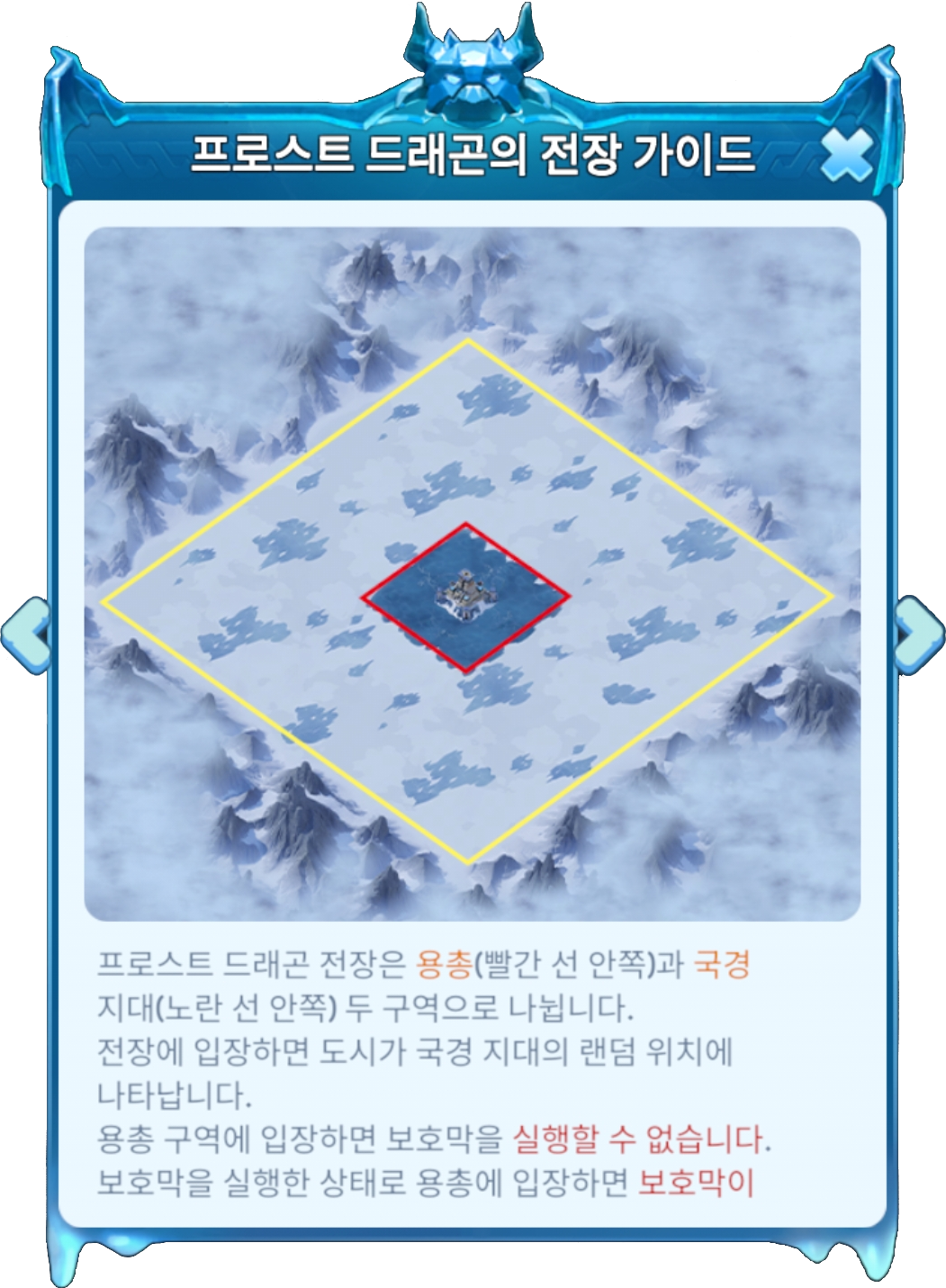 프로스트 드래곤 전장은 용총(빨간 선 안쪽)과 국경지대(노란 선 안쪽) 두 구역으로 나뉩니다. 전장에 입장하면 도시가 국경 지대의 랜덤 위치에 나타납니다. 용총 구역에 입장하면 보호막을 실행할 수 없습니다. 보호막을 실행한 상태로 용총에 입장하면 보호막이 사라지며, 용총 구역에 위치한 도시는 방어 실패시 국경 지대의 랜덤 위치로 이전 됩니다.