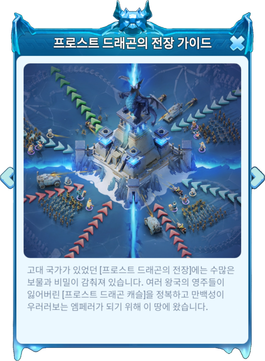 프로스트 드래곤 이벤트에서는 전략적 전투와 전장에서의 신중한 계획을 통해 포인트와 보상을 획득할 수 있습니다.