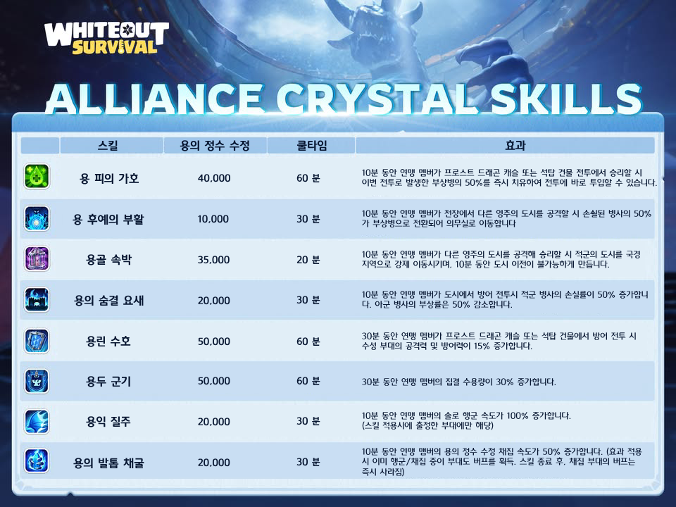 용의 정수 수정 수집 및 프로스트 드래곤 호위병 처치 시 연맹 용의 정수 수정을 획득할 수 있습니다. 연맹 맹주 및 R4 멤버는 연맹 용의 정수 수정을 소모하여 강력한 수정 스킬을 사용하여 캐슬 쟁탈에 도움을 줄수 있습니다.