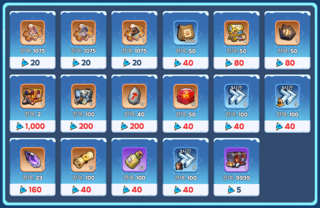 참고 : 프로스트 드래곤 선물(무료)와 특가 용 비늘 수정 패키지(HOT)은 매일 새로고침 되며 나머지 패키지는 새로고침 되지 않으며 이벤트가 끝날때까지 최대 횟수까지 구매가 가능합니다.