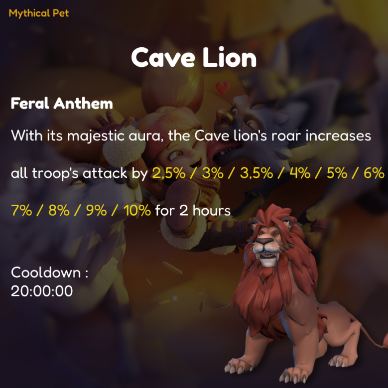 Skill Effect: With its majestic aura, the Cave Lion's roar increases all troops' attack by 2.50% / 3.00% / 3.50% / 4.00% / 5.00% / 6.00% / 7.00% / 8.00% / 9.00% /