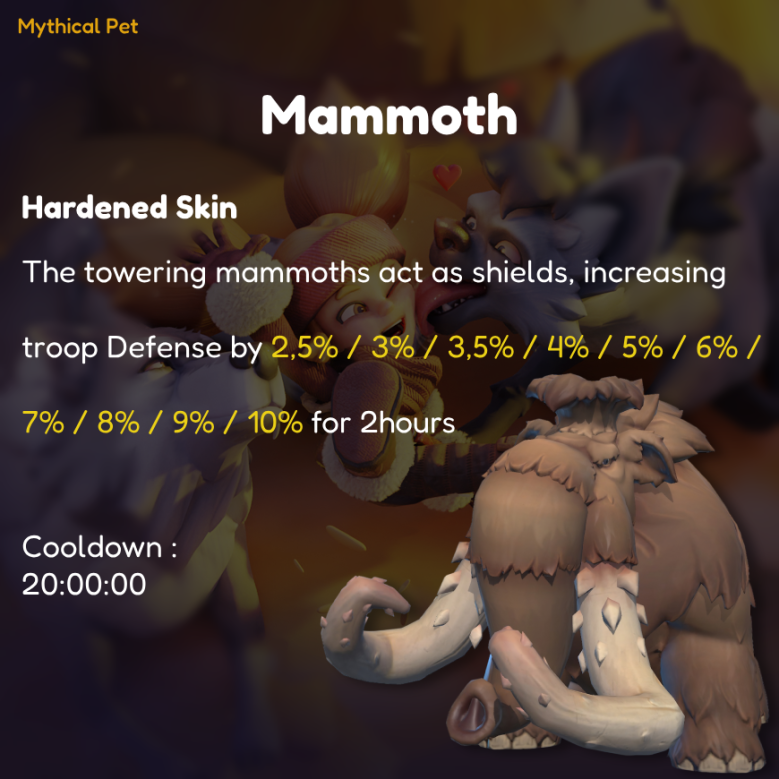 Skill Effect: The towering Mammoths act as shields, increasing Troops Defense by 2.50% / 3.00% / 3.50% / 4.00% / 5.00% / 6.00% / 7.00% / 8.00% / 9.00% / 10.00% for 2 hours. Cooldown: 20:00:00